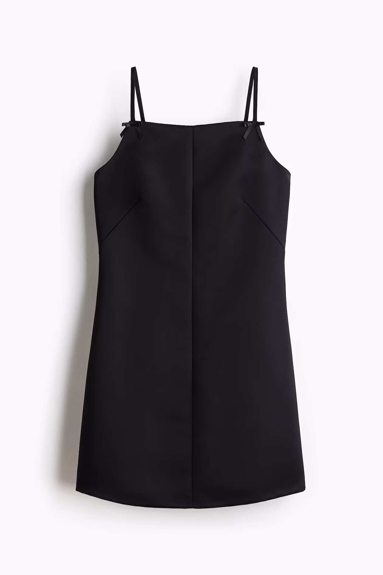 Short dress in satin with a fitted bodice and gently flared skirt. Narrow, adjustable shoulder straps with a decorative satin bow at front. Straight neckline, visible seams at front and back, and a concealed zipper at back. Unlined.