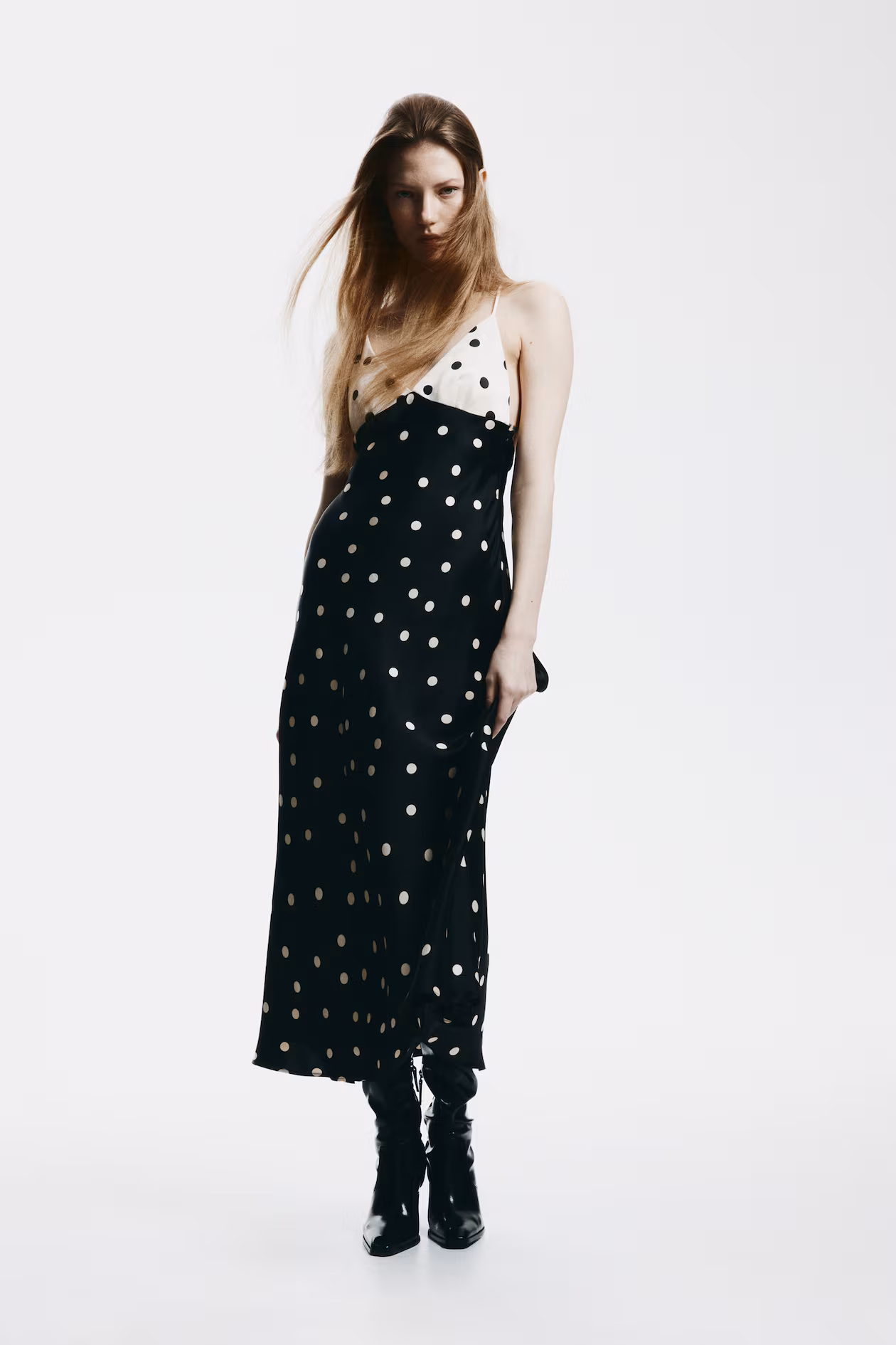 Fitted, calf-length dress in softly draped satin. Extra-narrow shoulder straps threaded through a strappy detail at back, V-neck at front, and low-cut back. Contrasting cups, concealed zipper at one side with hook-and-eye fastener, and a gently flared skirt.