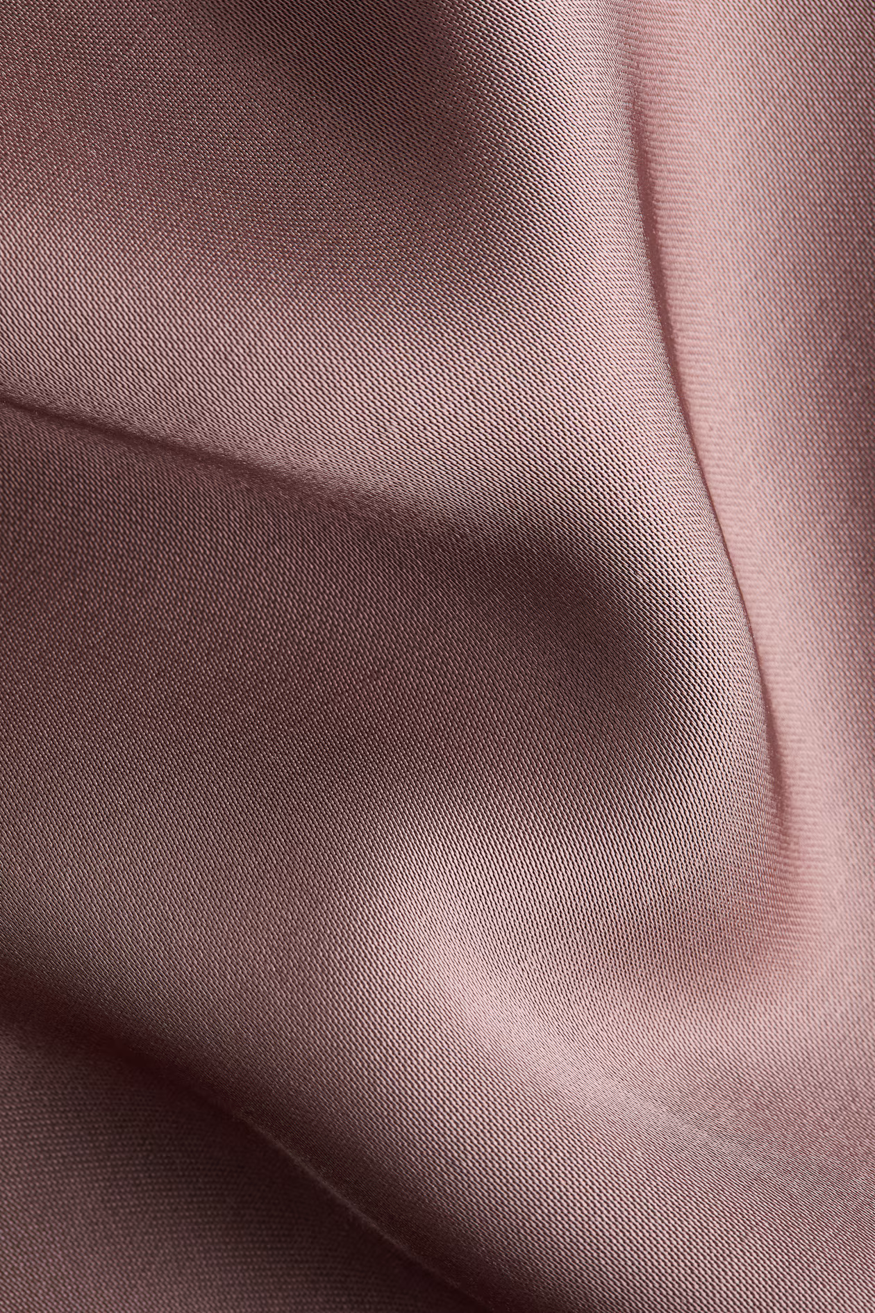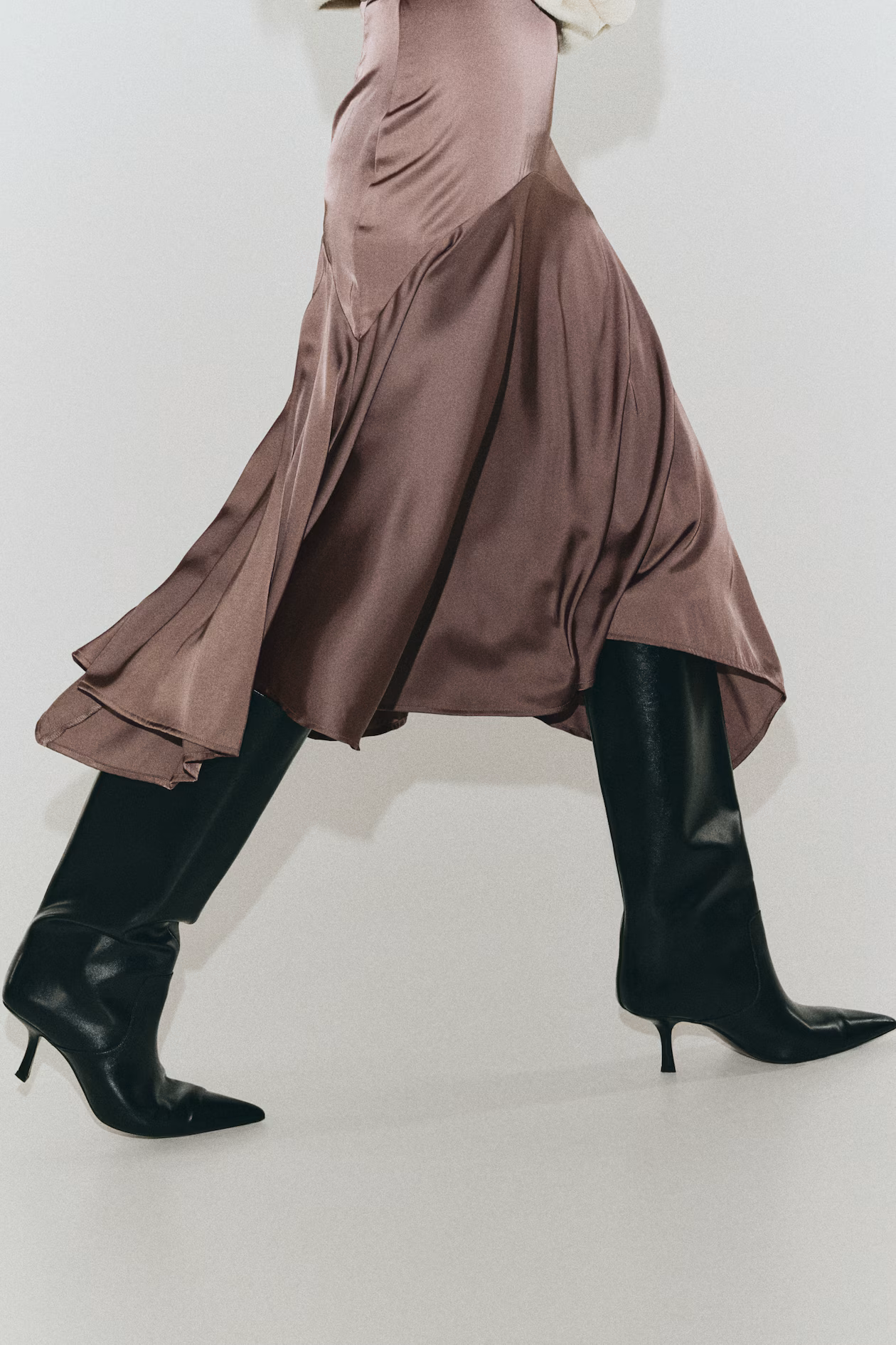 Fitted, calf-length skirt in softly draped satin twill. High waist, concealed zipper at one side with hook-and-eye fastener, and a curved seam below hips creating soft, draped folds to hem. Curved hem. Unlined.