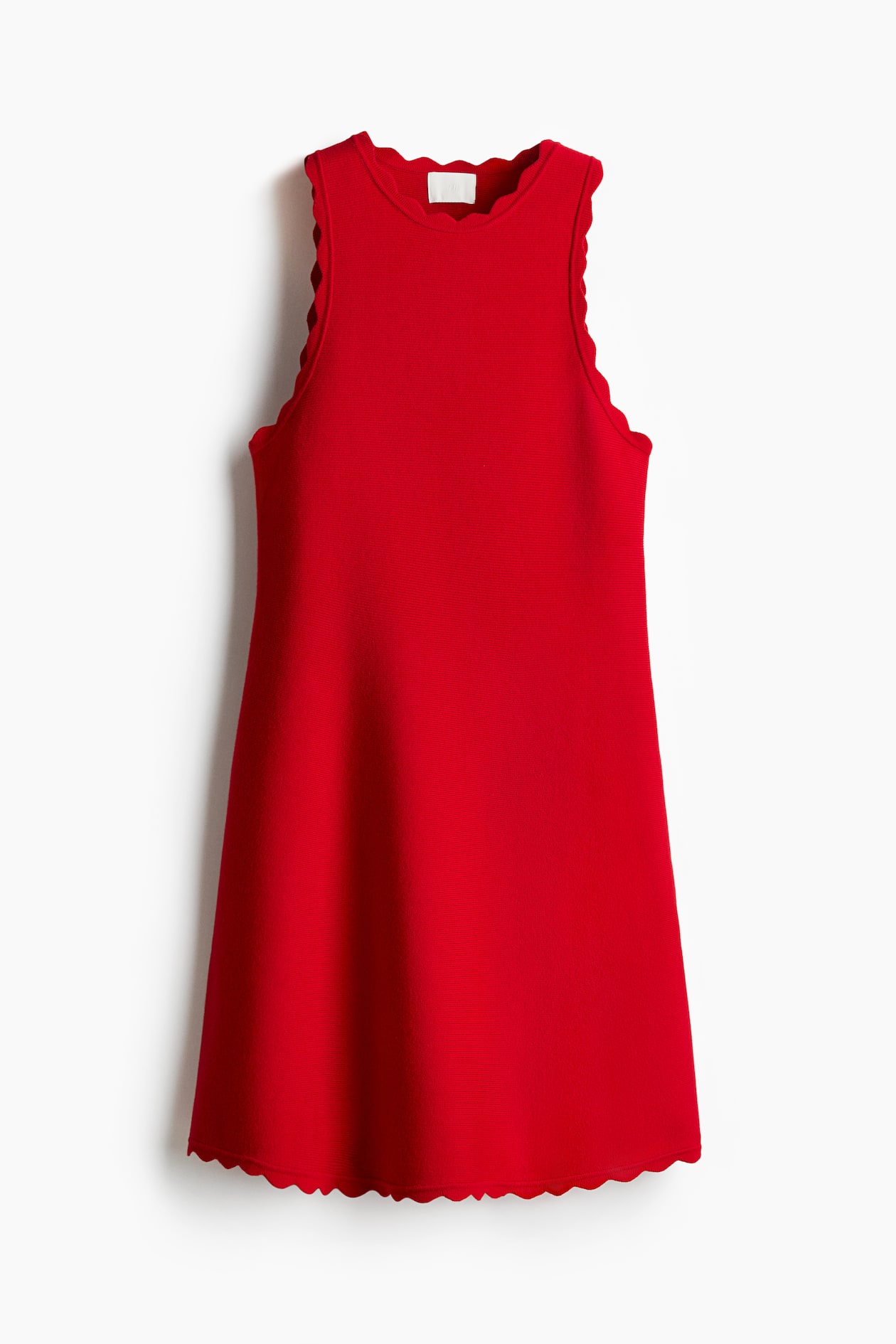 Short, fitted, sleeveless dress in a soft, horizontal rib knit with scalloped edges. Round neckline and an A-line skirt.