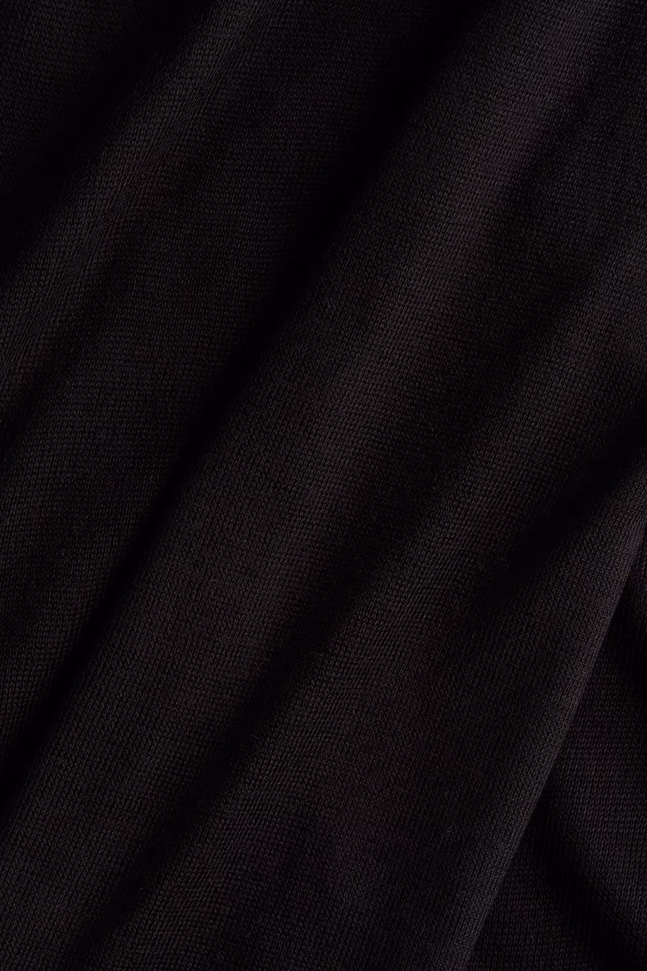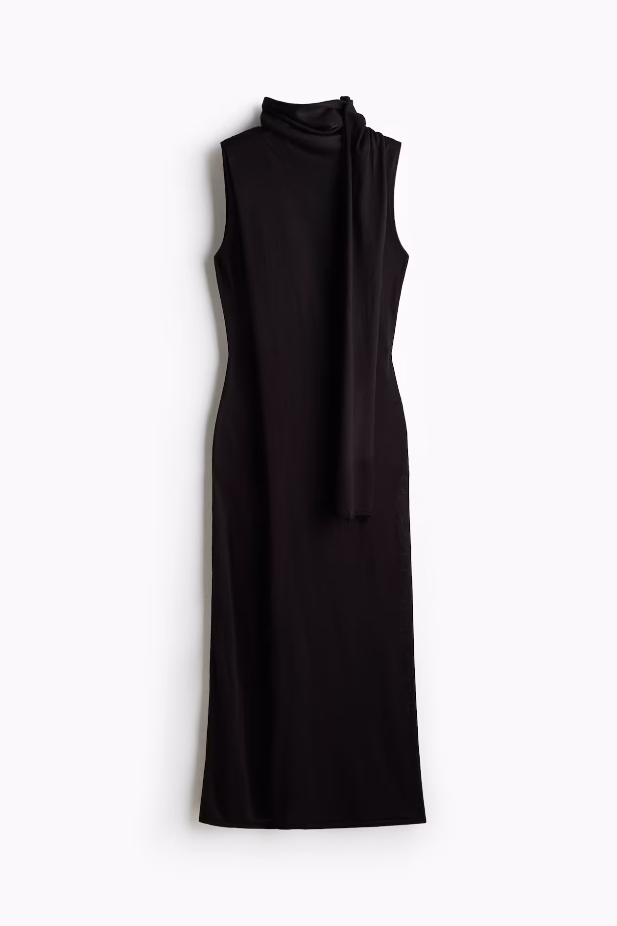 Long, fitted, sleeveless dress in a fine knit. Scarf collar.