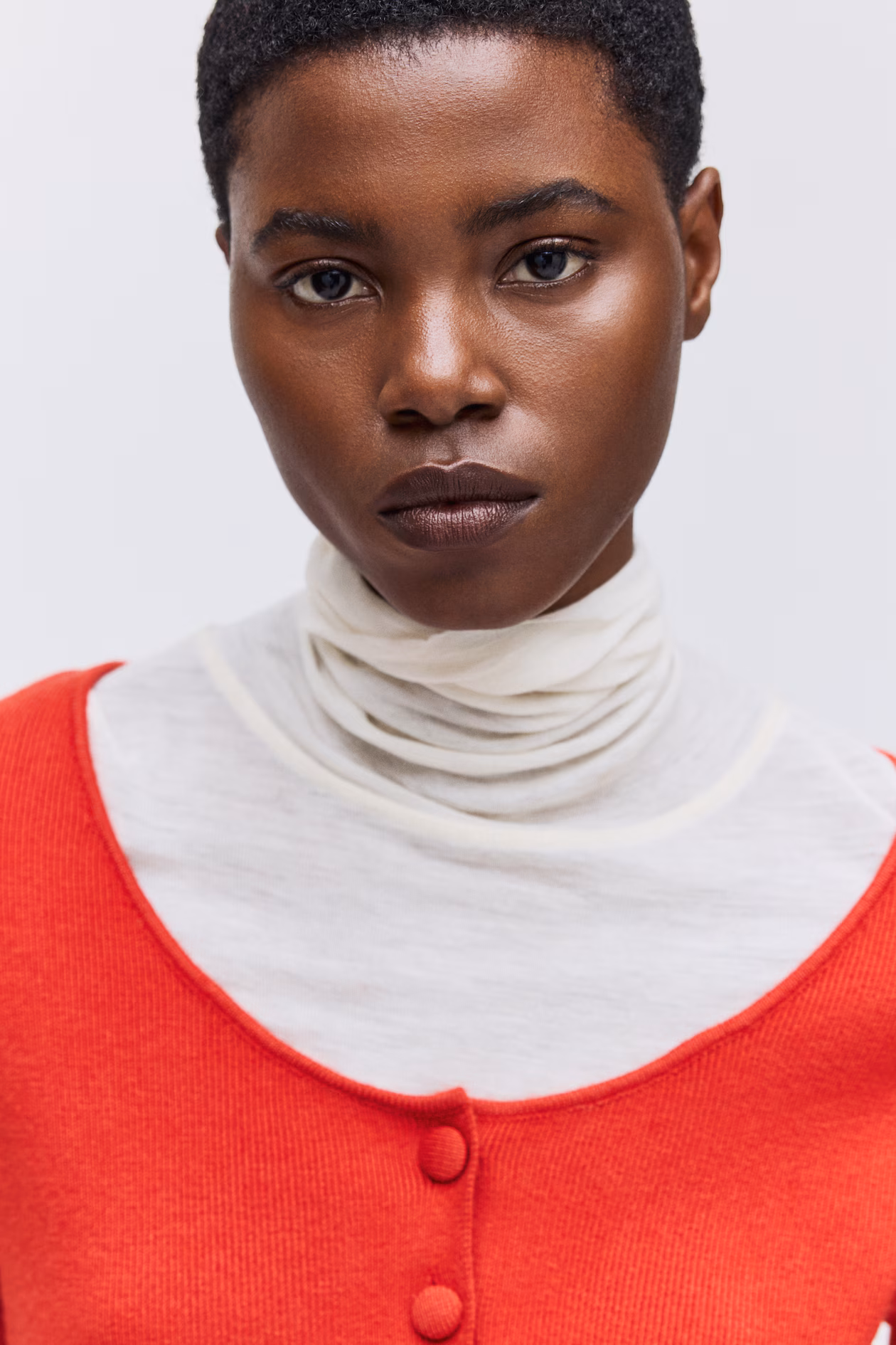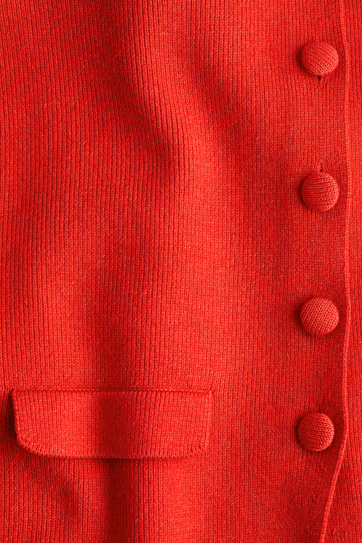 Fitted cardigan in a soft rib knit with wool content. Scoop neck, buttons at front, and front pockets with flap. Long sleeves.