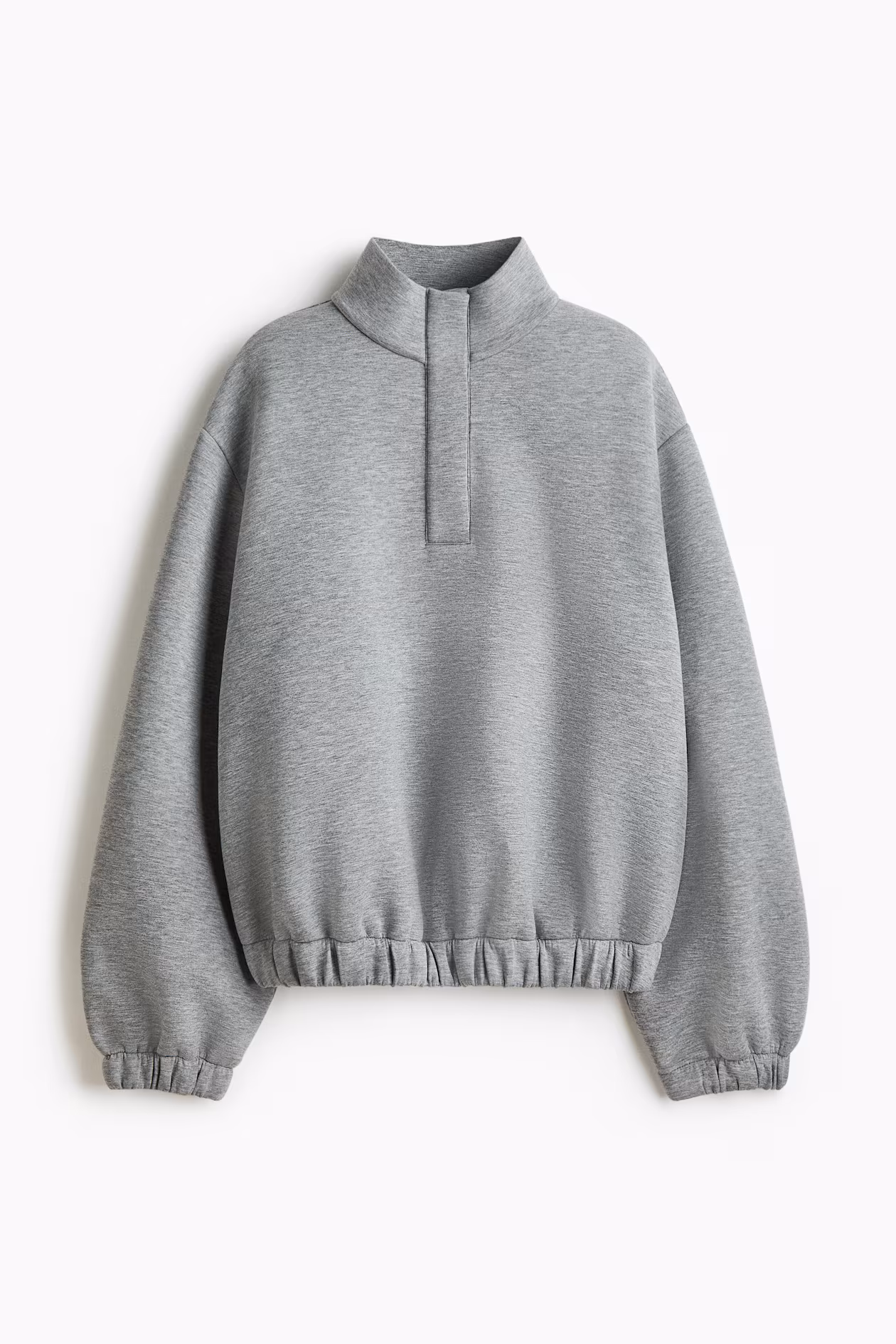Loose-fit sweatshirt in scuba fabric. Stand-up collar, short placket with concealed snap fasteners, dropped shoulders, and long sleeves. Covered elastic at cuffs and hem.