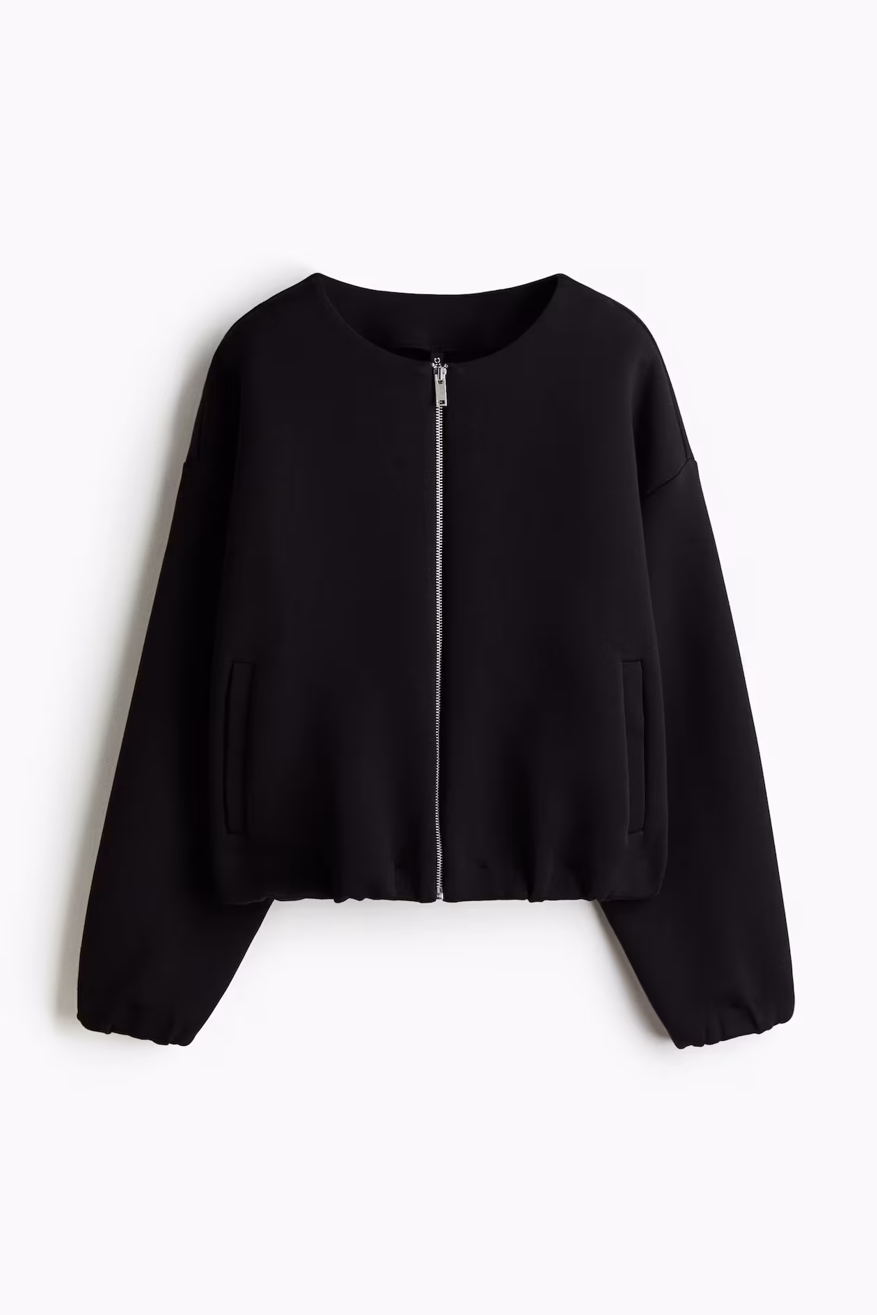 Oversized sweatshirt in soft scuba fabric. Round neckline, zipper at front, dropped shoulders, and welt front pockets. Covered elastic at cuffs and hem.