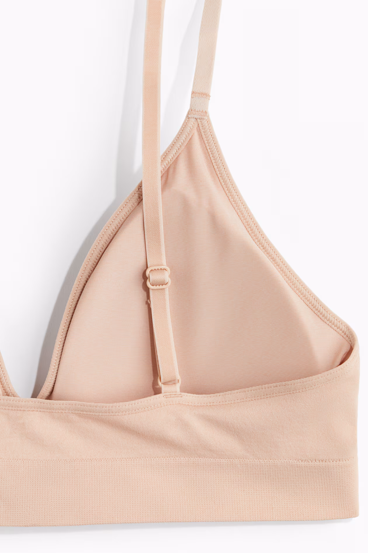 Soft-cup bra designed with a minimum number of seams for seamless comfort on skin. Adjustable shoulder straps, lined cups with removable inserts for shaping and good support, and no fasteners.