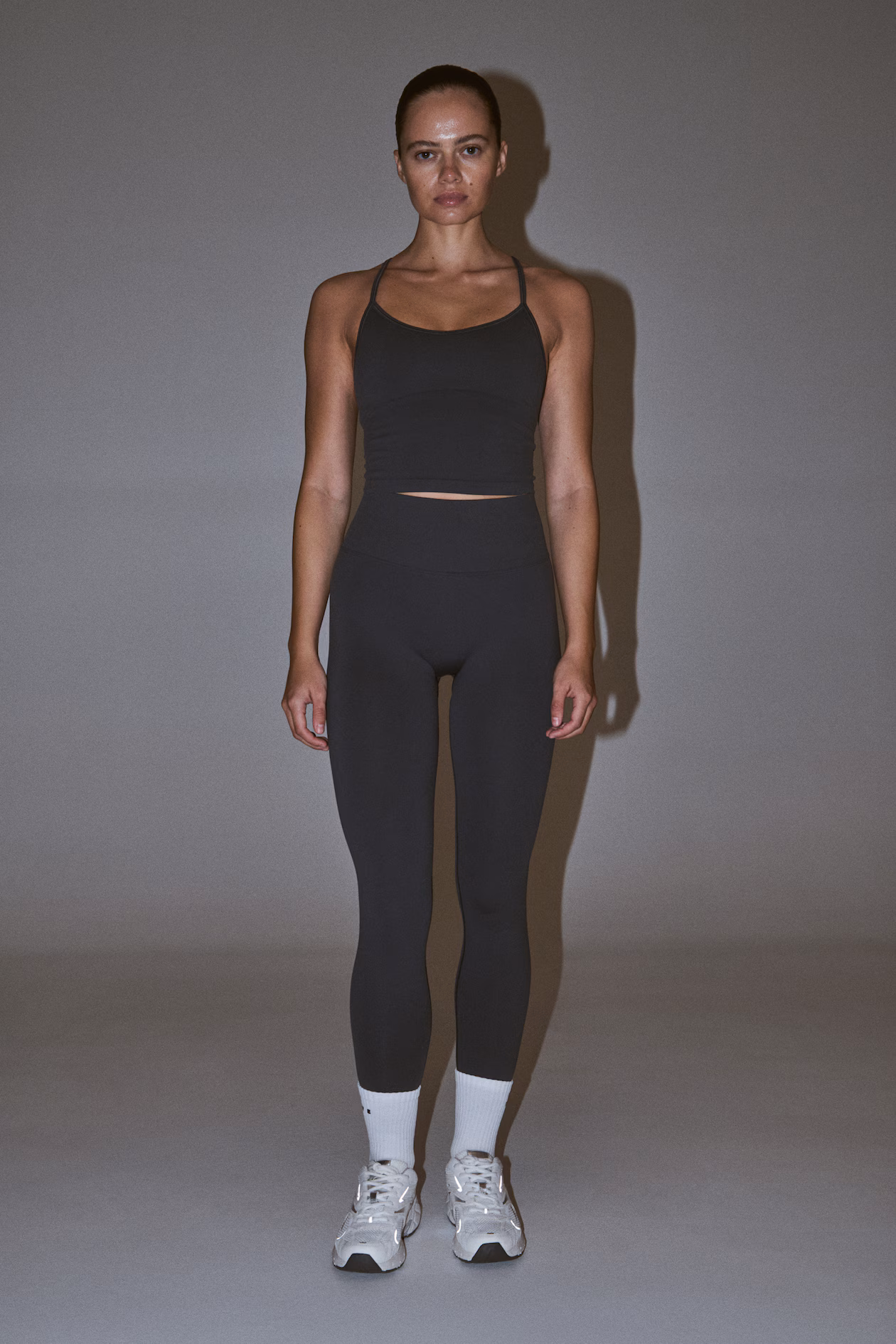 Sports leggings in functional fabric made with DryMove™ to wick away moisture from skin and keep you comfortably dry while moving. High waist, wide waistband, and a scrunch detail at back. Designed with minimal seams for added comfort and increased freedom of movement.