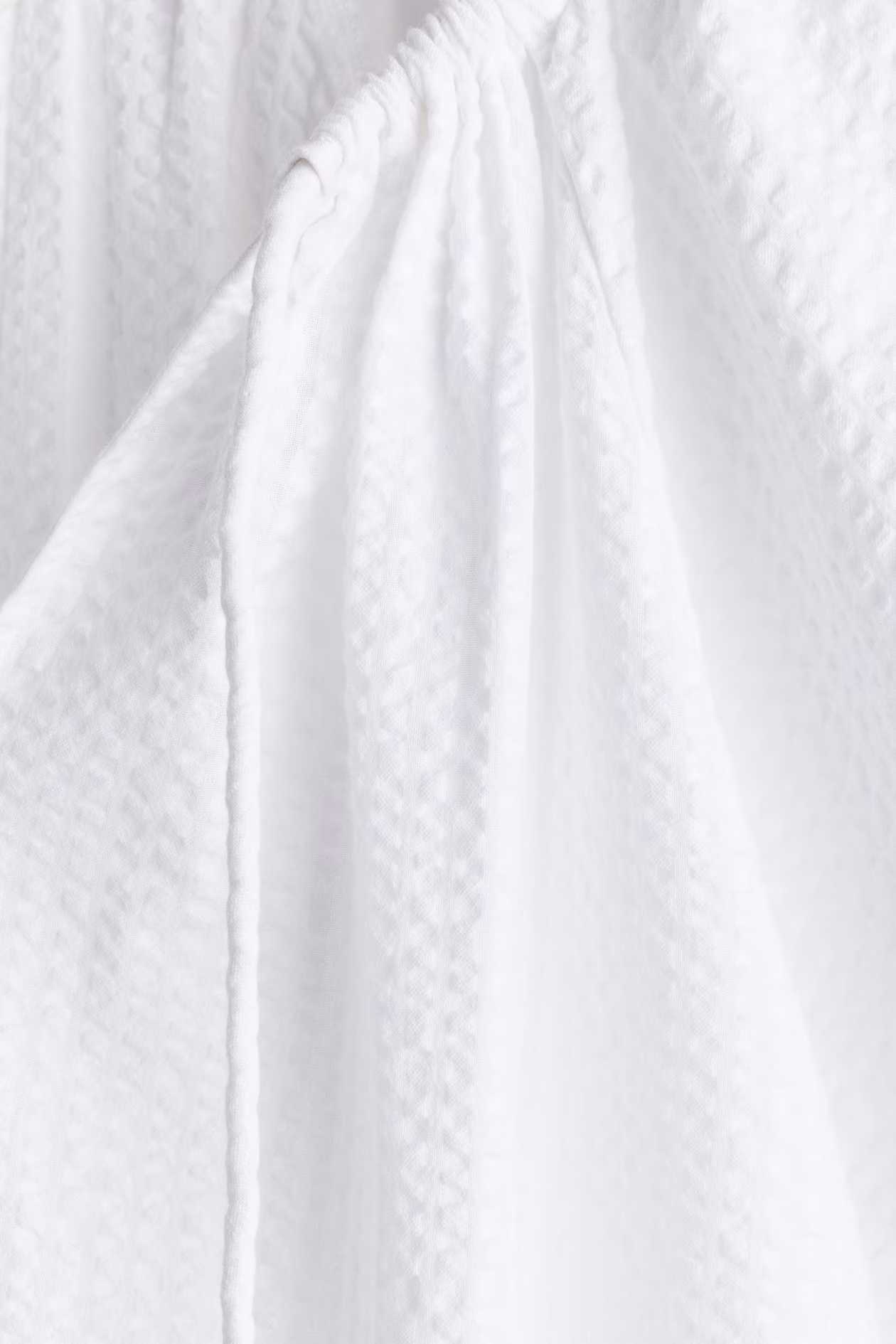 Short, loose-fit, A-line dress in airy cotton seersucker. Round neckline with drawstring, a V-shaped opening at front, and long raglan balloon sleeves with narrow elastic at cuffs. Unlined.