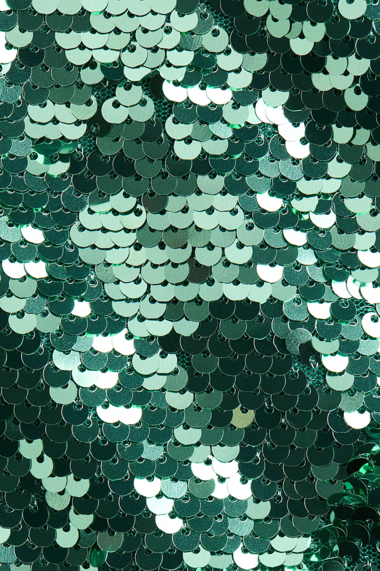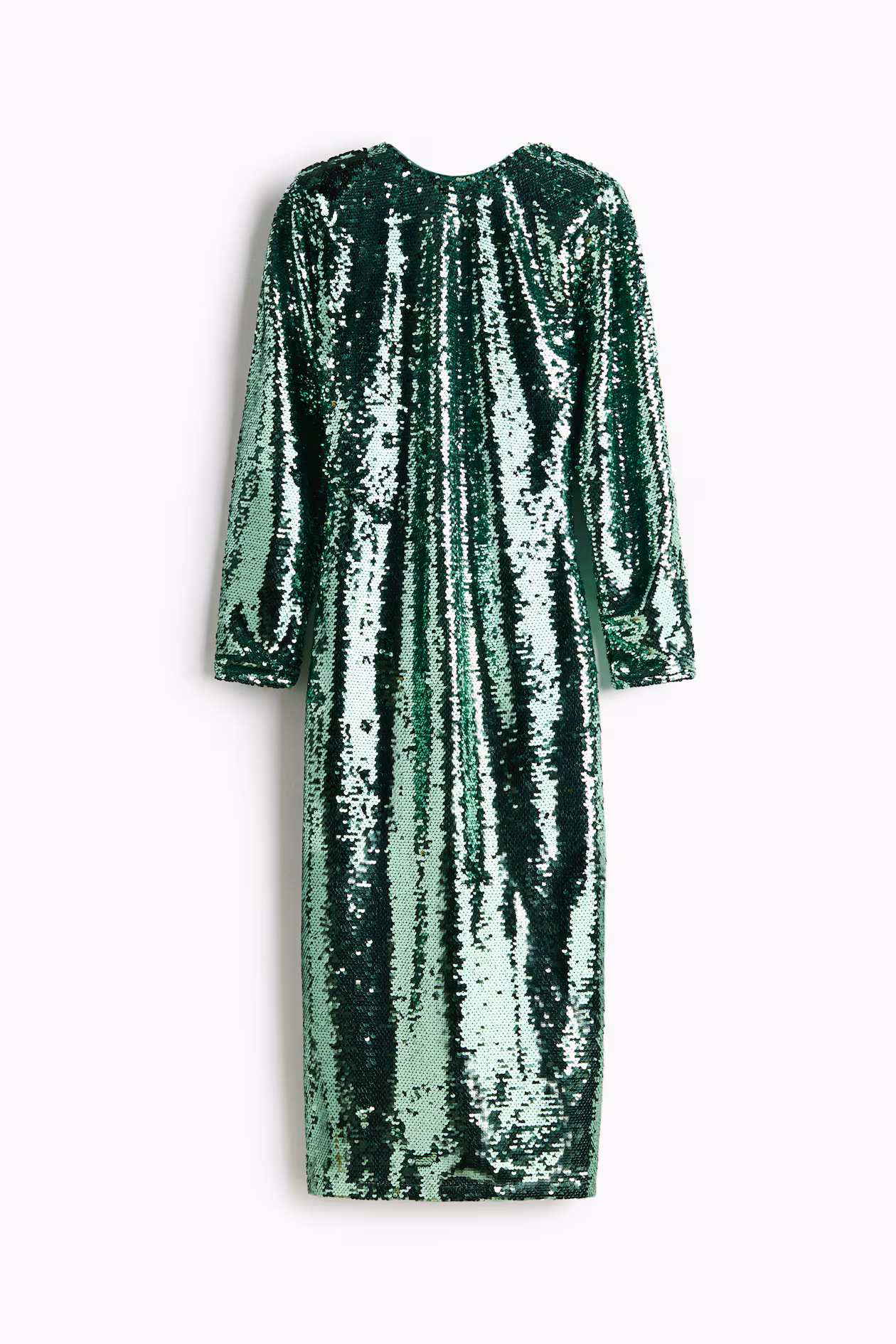 Calf-length dress in sequined mesh. Round neckline at front and an open back with velour ties at back of neck. Shoulder pads, long sleeves, and a concealed zipper at waist. Straight-cut hem. Jersey lining.