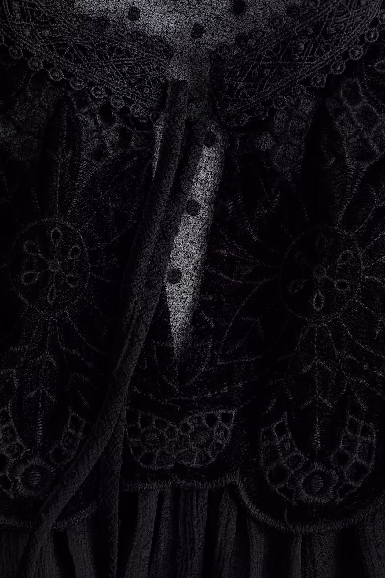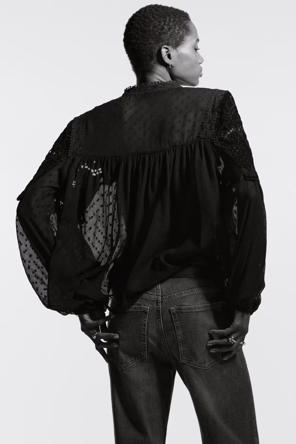 Blouse in a sheer, woven plumeti fabric with a band collar in lace. V-shaped opening at front with narrow ties, an embroidered yoke at front, and long balloon sleeves with an embroidered section at top and narrow elastic at cuffs.