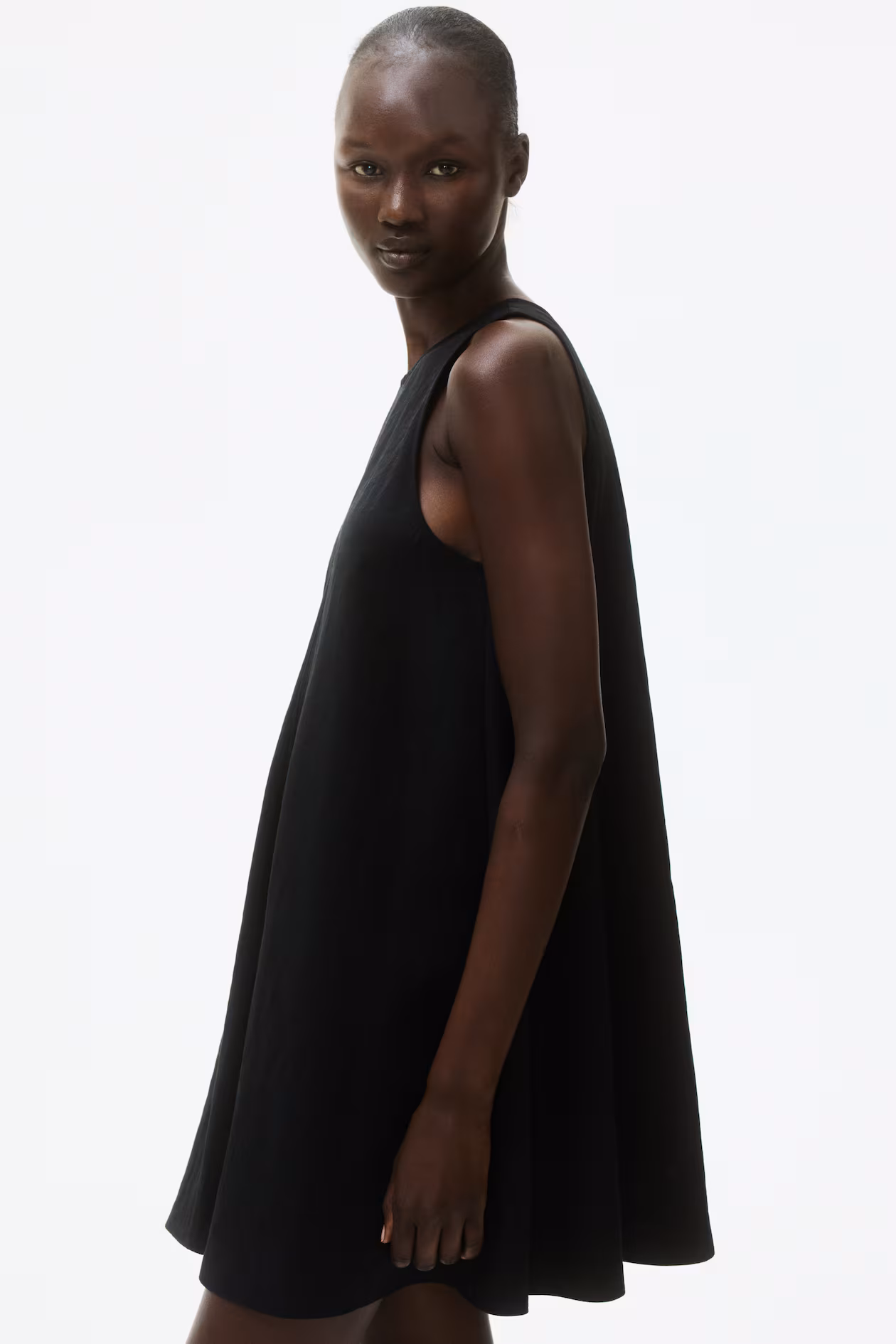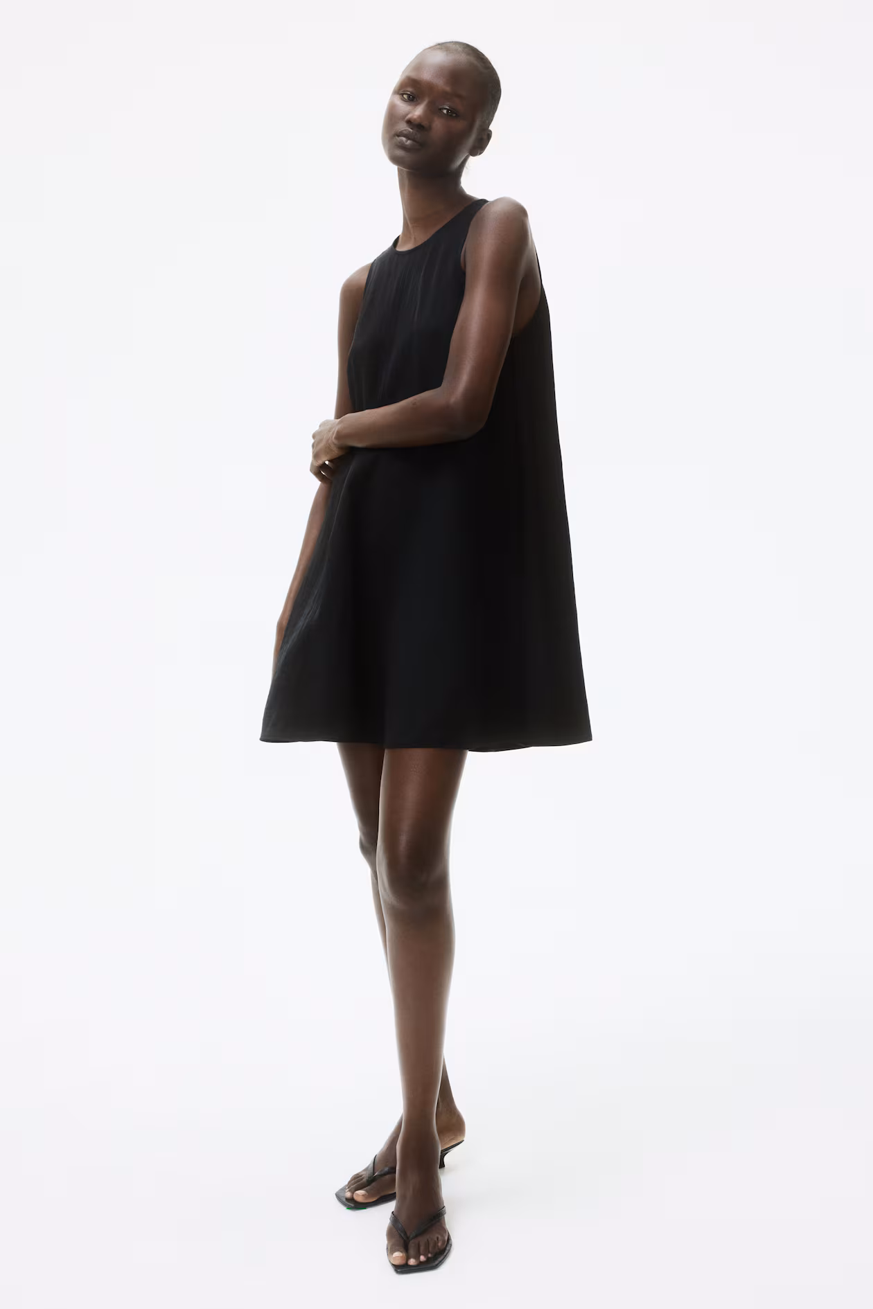Short, sleeveless, A-line dress in woven fabric. Round neckline and a keyhole opening at back with concealed button. Unlined.