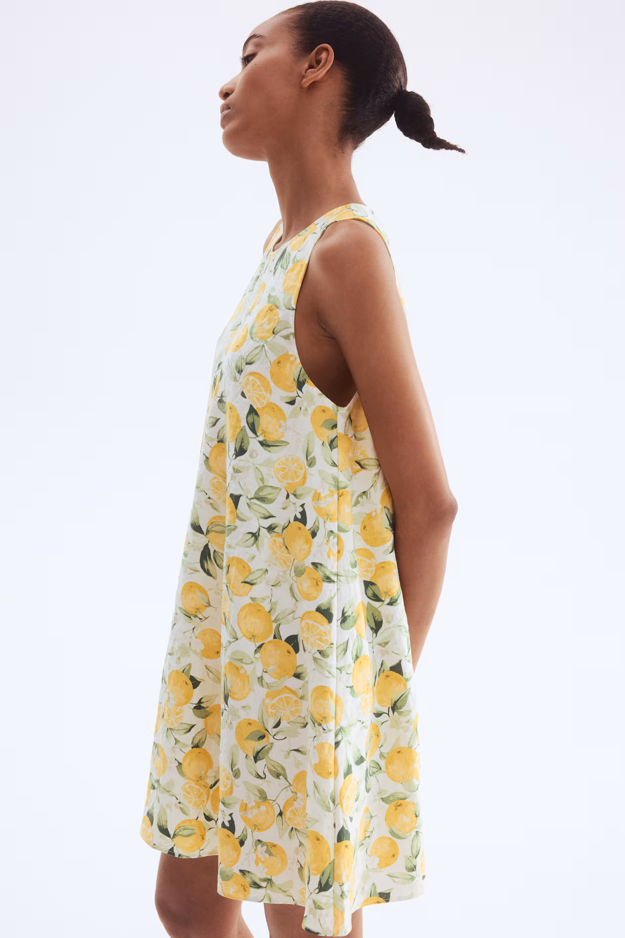 Short, sleeveless, A-line dress in woven fabric. Round neckline and a keyhole opening at back with concealed button. Unlined.