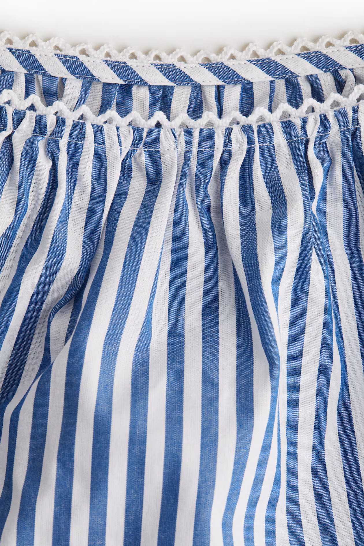 Short blouse in crisp cotton poplin. Elasticized, picot-trimmed square neckline, tapered section at waist with pleats at front and narrow elastic, and short sleeves with elasticized cuffs.