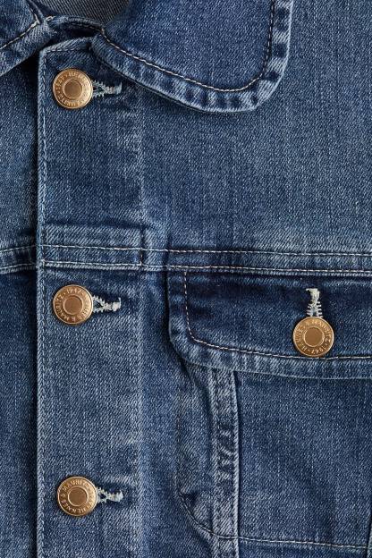 Short, fitted jacket in cotton denim. Collar, metal buttons at front, and chest pockets with flap and button. Long sleeves with button at cuffs.