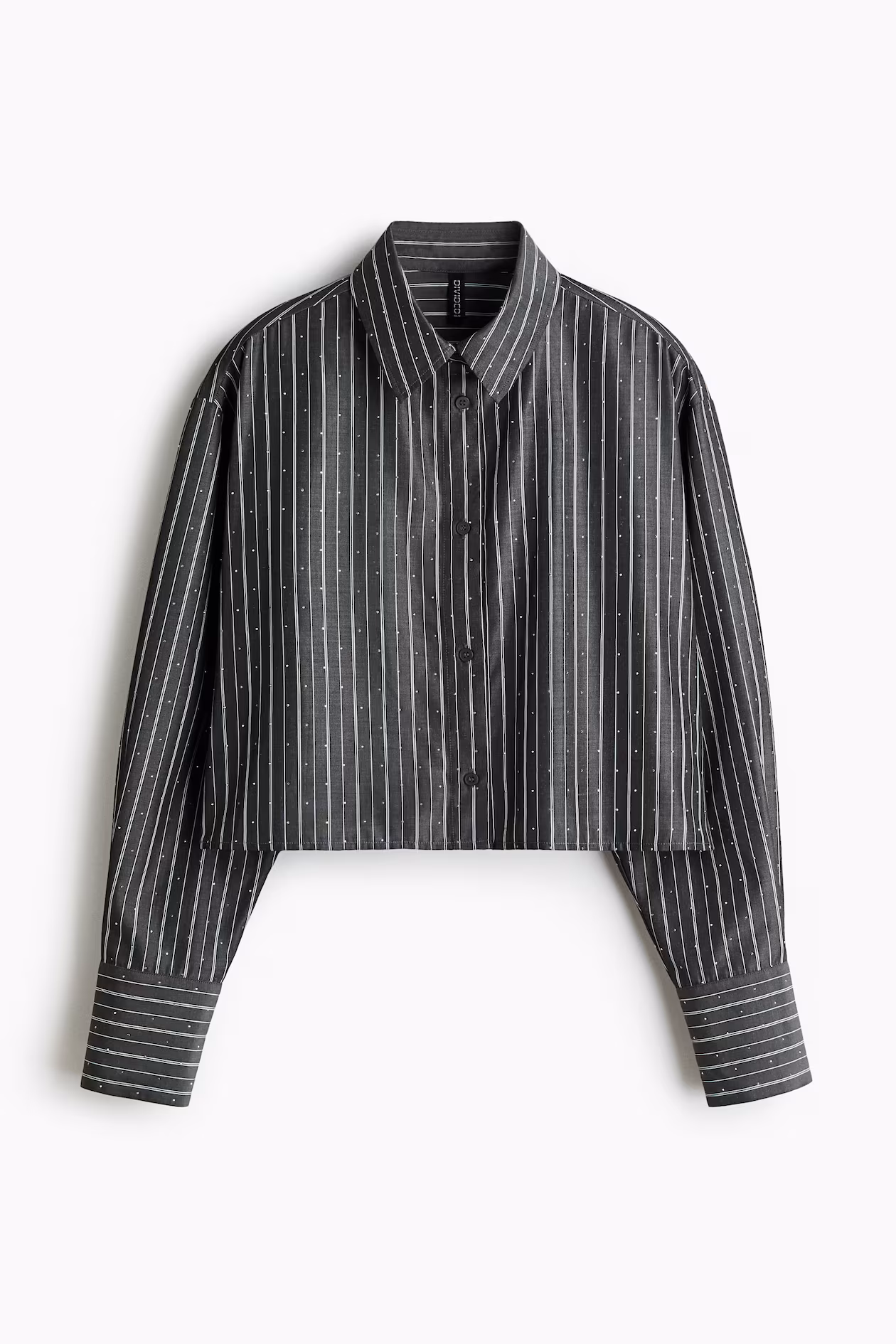 Short, boxy shirt in woven fabric fully embellished with rhinestones. Collar, buttons at front, and a yoke at back. Gently dropped shoulders and long sleeves with button at cuffs. Straight-cut hem.