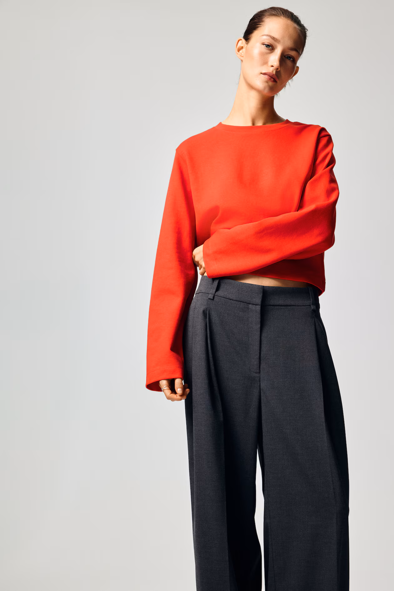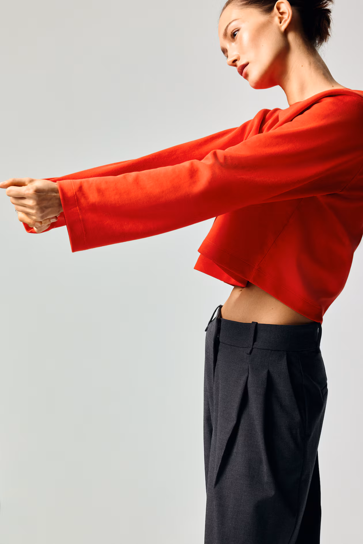 Short top in interlock jersey. Ribbed round neckline, gently dropped shoulders, and long sleeves.