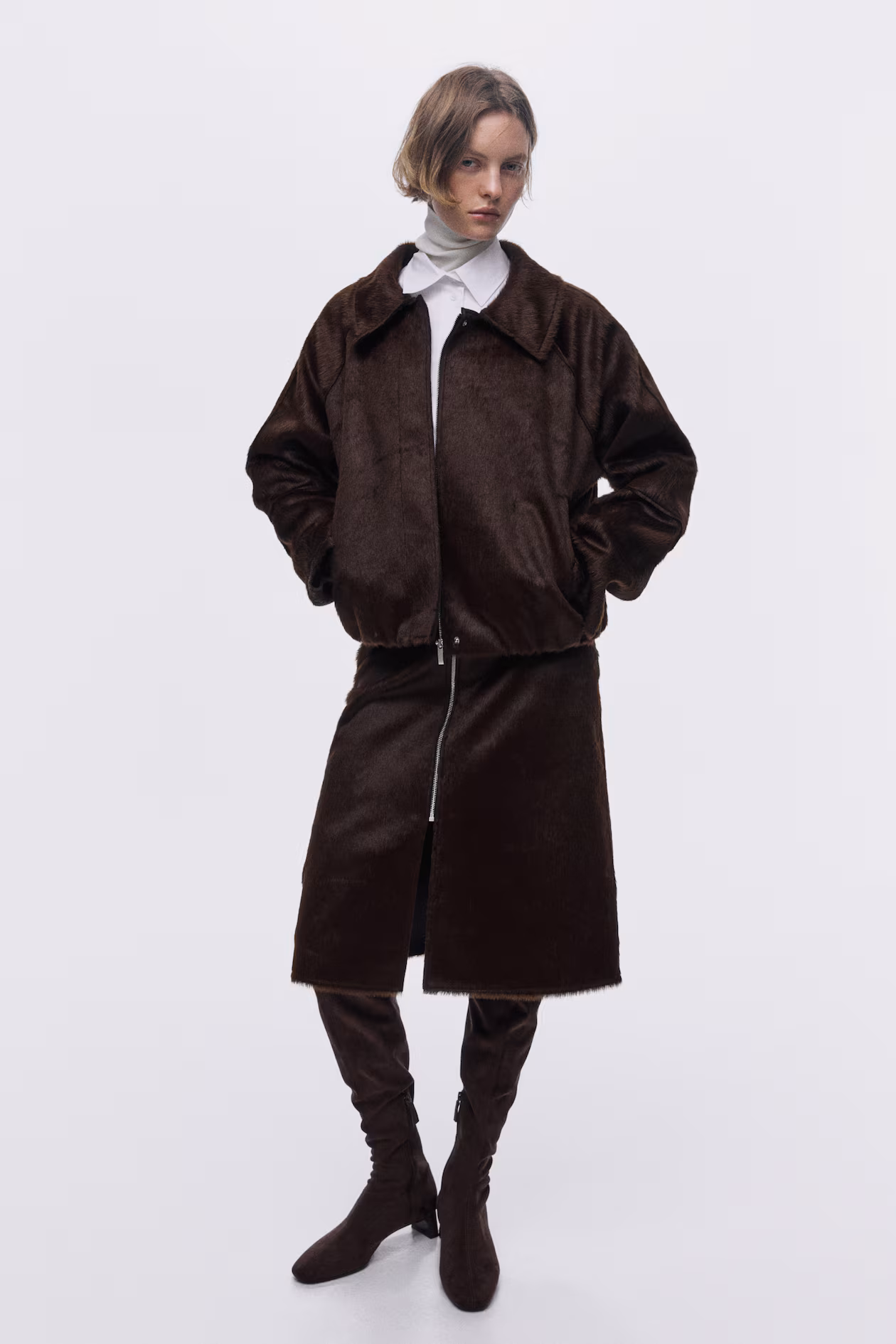 Short, loose-fit jacket with a textured, napped finish. Collar, zipper at front with wind flap and concealed snap fasteners, welt side pockets, and raglan sleeves. Covered elastic at hem. Unlined.