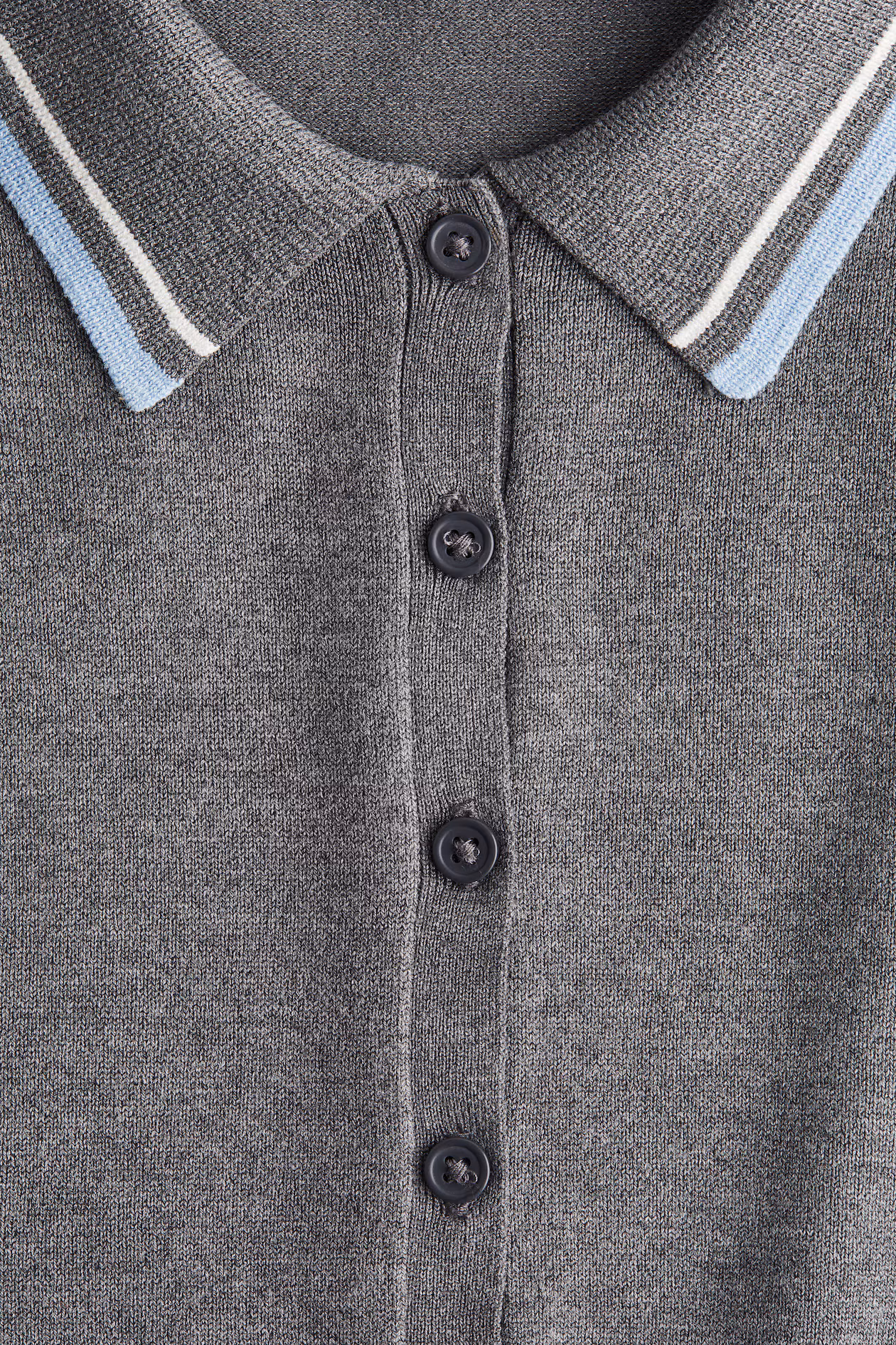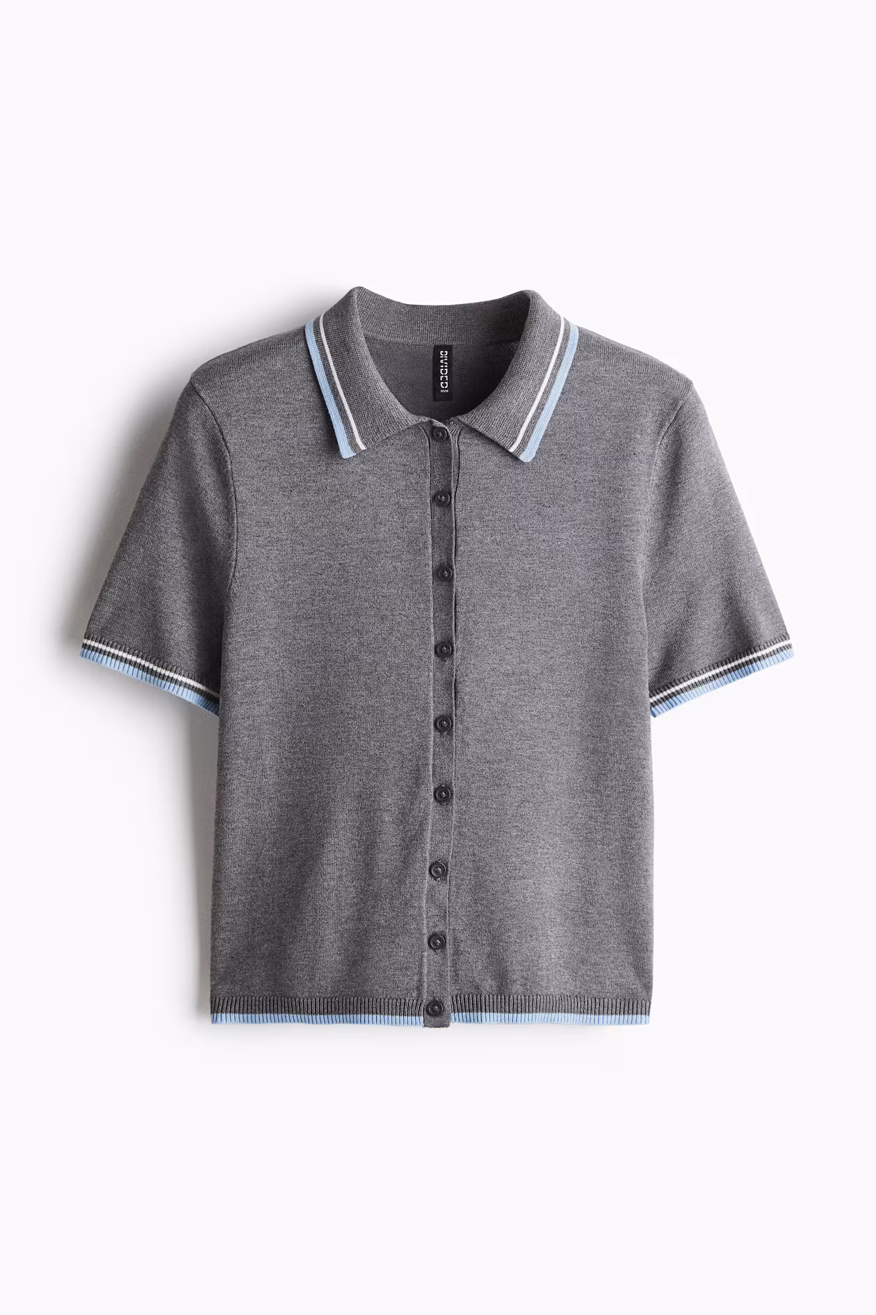 Short, fitted cardigan in a soft, fine knit. Collar, buttons at front, and short sleeves. Ribbing at cuffs and hem.