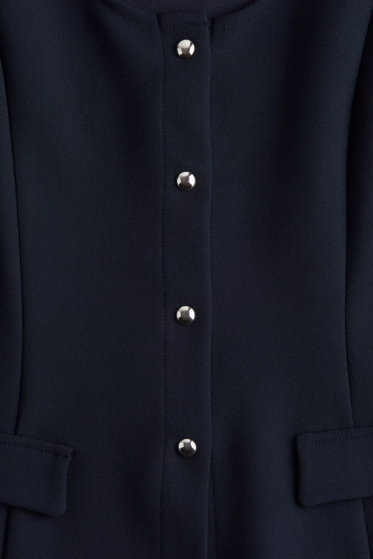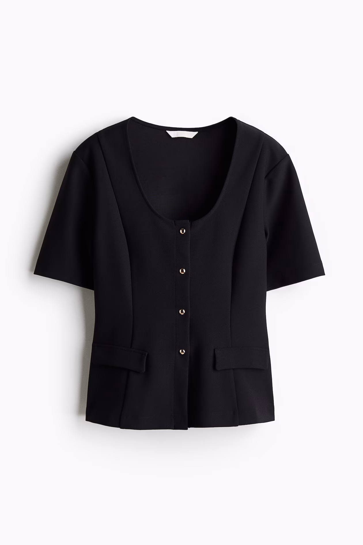 Short-sleeved cardigan in thick jersey with shaping seams at front and back. Scoop neck, snap fasteners at front, and decorative front pocket flaps.
