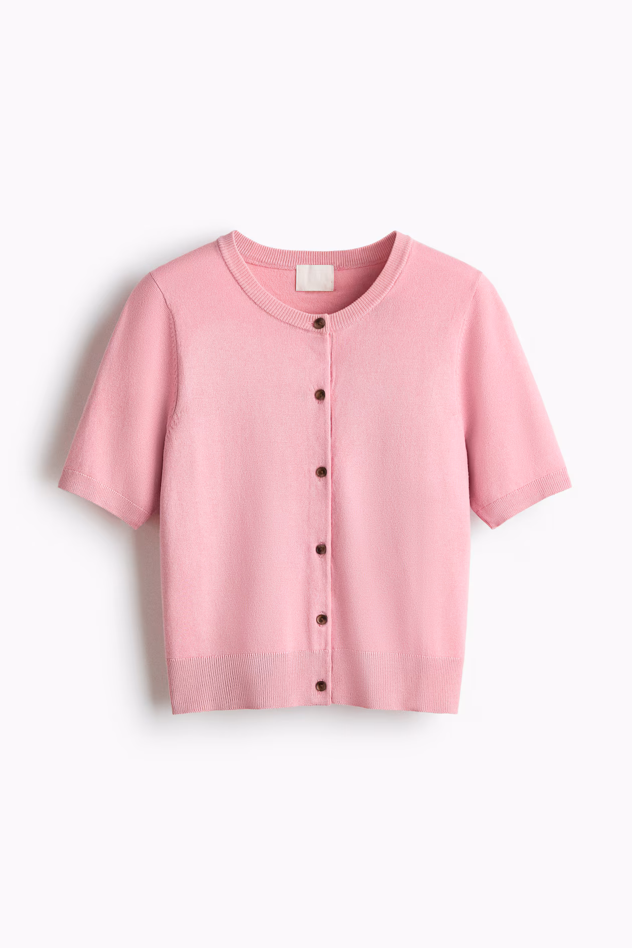 Soft, fine-knit cardigan. Round neckline, buttons at front, and short sleeves. Ribbing at neckline, cuffs, and hem.