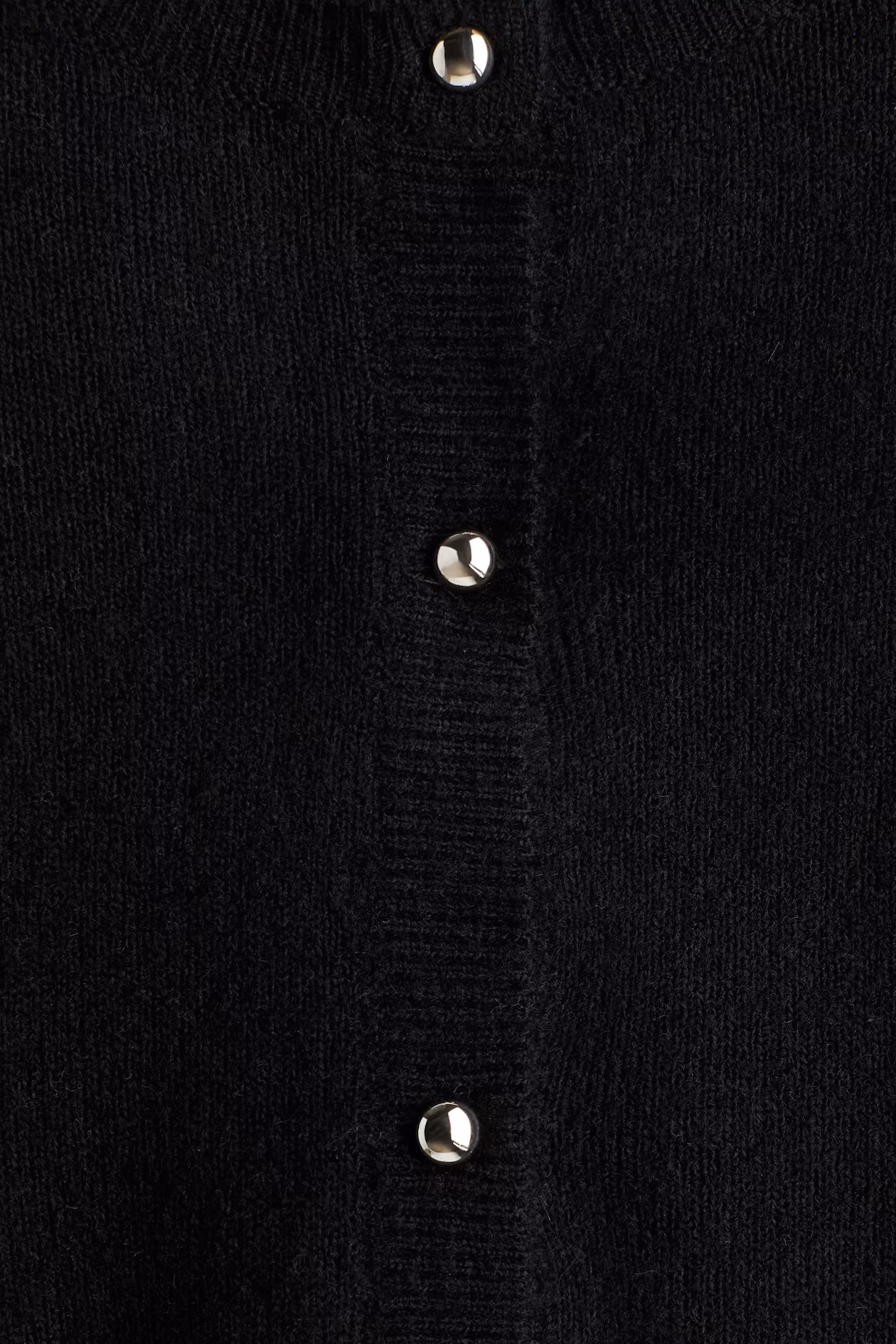 Short, fitted cardigan in a soft, fine knit. Round, ribbed neckline, ribbed placket with shimmery metallic buttons, and short sleeves. Rolled edges at cuffs and hem.