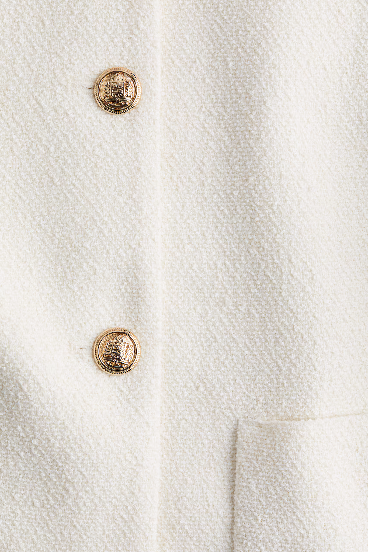 Short, fitted jacket in woven, textured fabric. Collar, metal buttons at front with a motif, and patch front pockets. Elbow-length raglan sleeves. Lined.