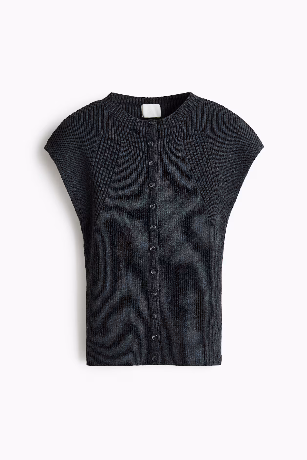 Short, fitted cardigan in a rib knit. Round neckline, buttons at front, and cap sleeves.