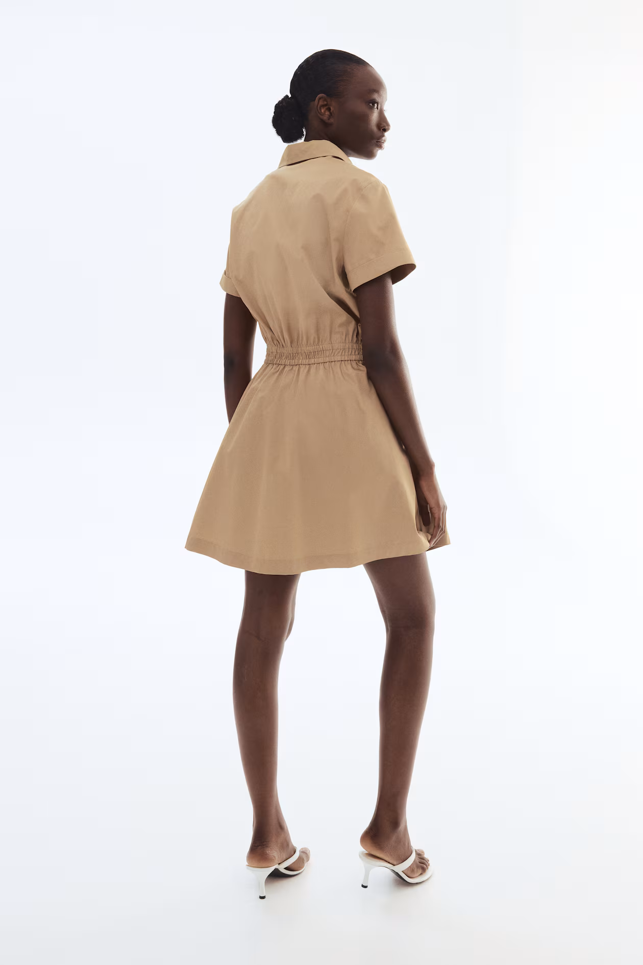 Short dress in crisp cotton poplin with a gently flared skirt. Collar, buttons full length of front, and smocked elastic at waist. Short sleeves with sewn foldover cuffs. Unlined.