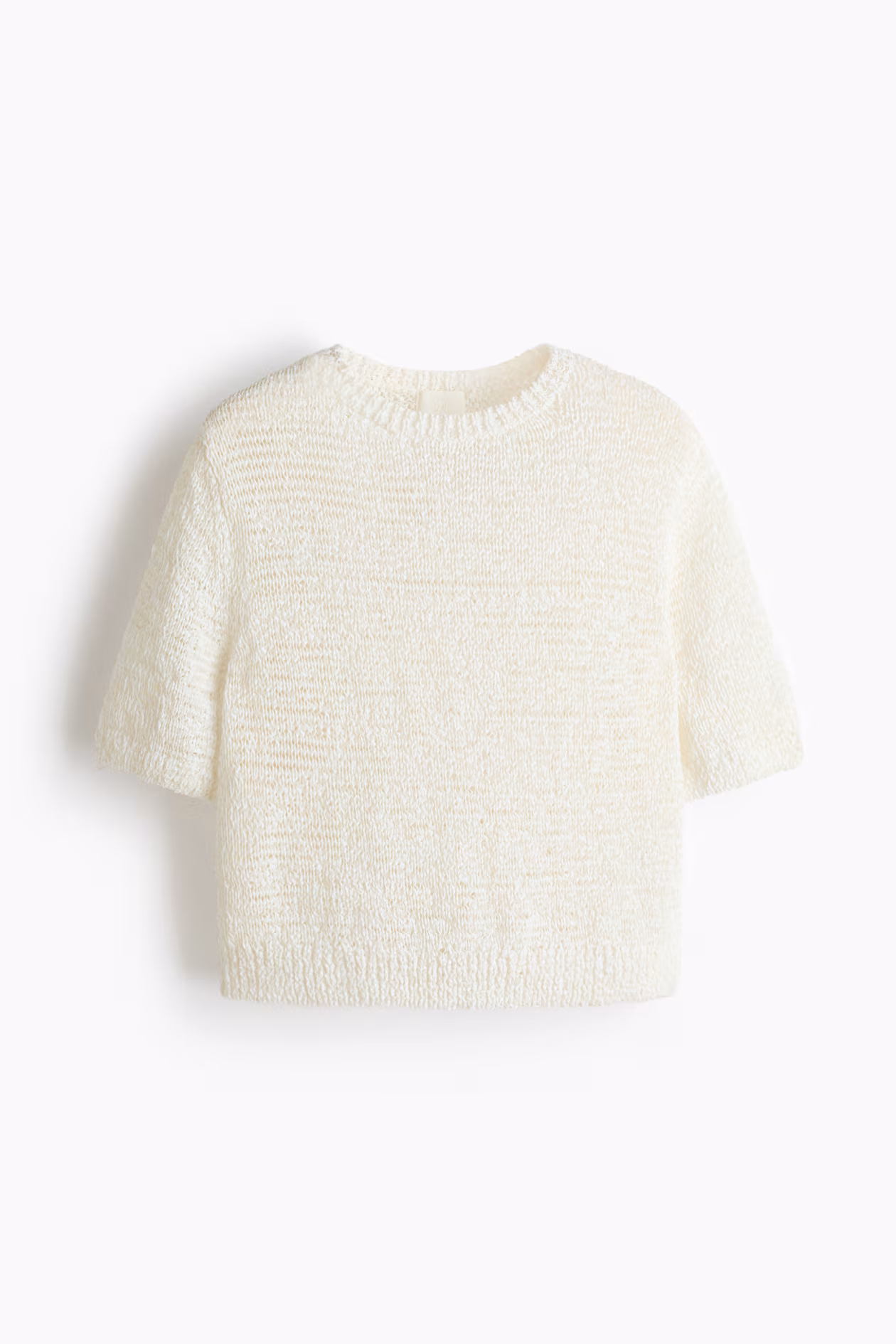 Textured-knit sweater. Round neckline, short sleeves, and ribbing at neckline, cuffs, and hem.