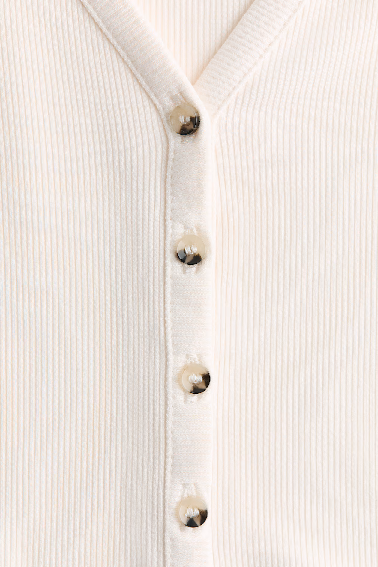 Bodysuit in ribbed viscose jersey. Low-cut V-neck, buttons at front, and short sleeves. Concealed snap fasteners at gusset and cutaway coverage at back.