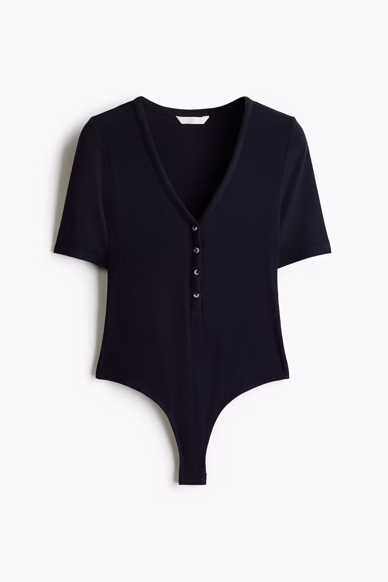 Bodysuit in ribbed viscose jersey. Low-cut V-neck, buttons at front, and short sleeves. Concealed snap fasteners at gusset and cutaway coverage at back.