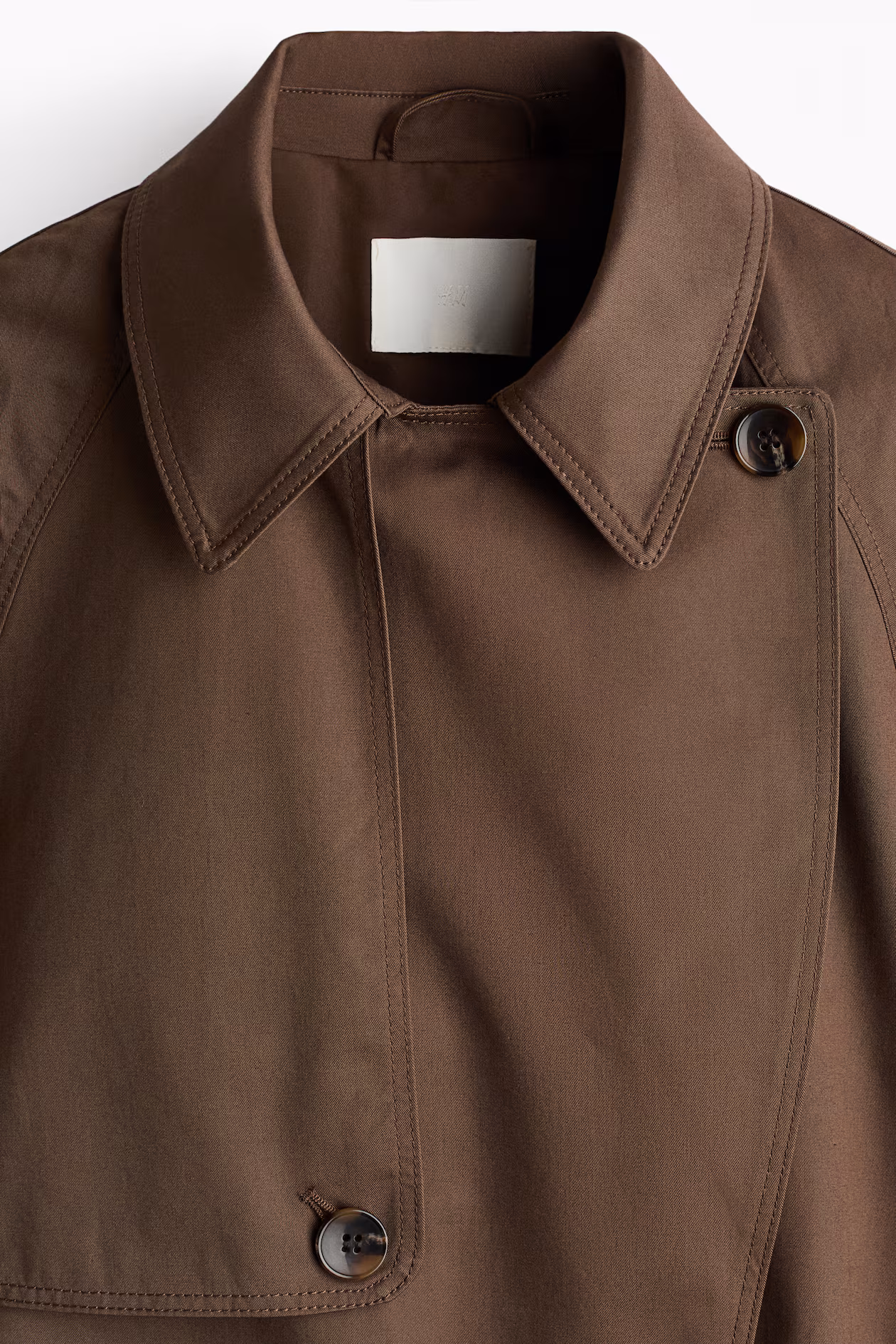 Short, double-breasted trench coat in cotton twill. Collar, storm flap at front with button, and a semi-attached yoke at back. Raglan sleeves, tie belt at waist, and side pockets with flap and button. Lined.