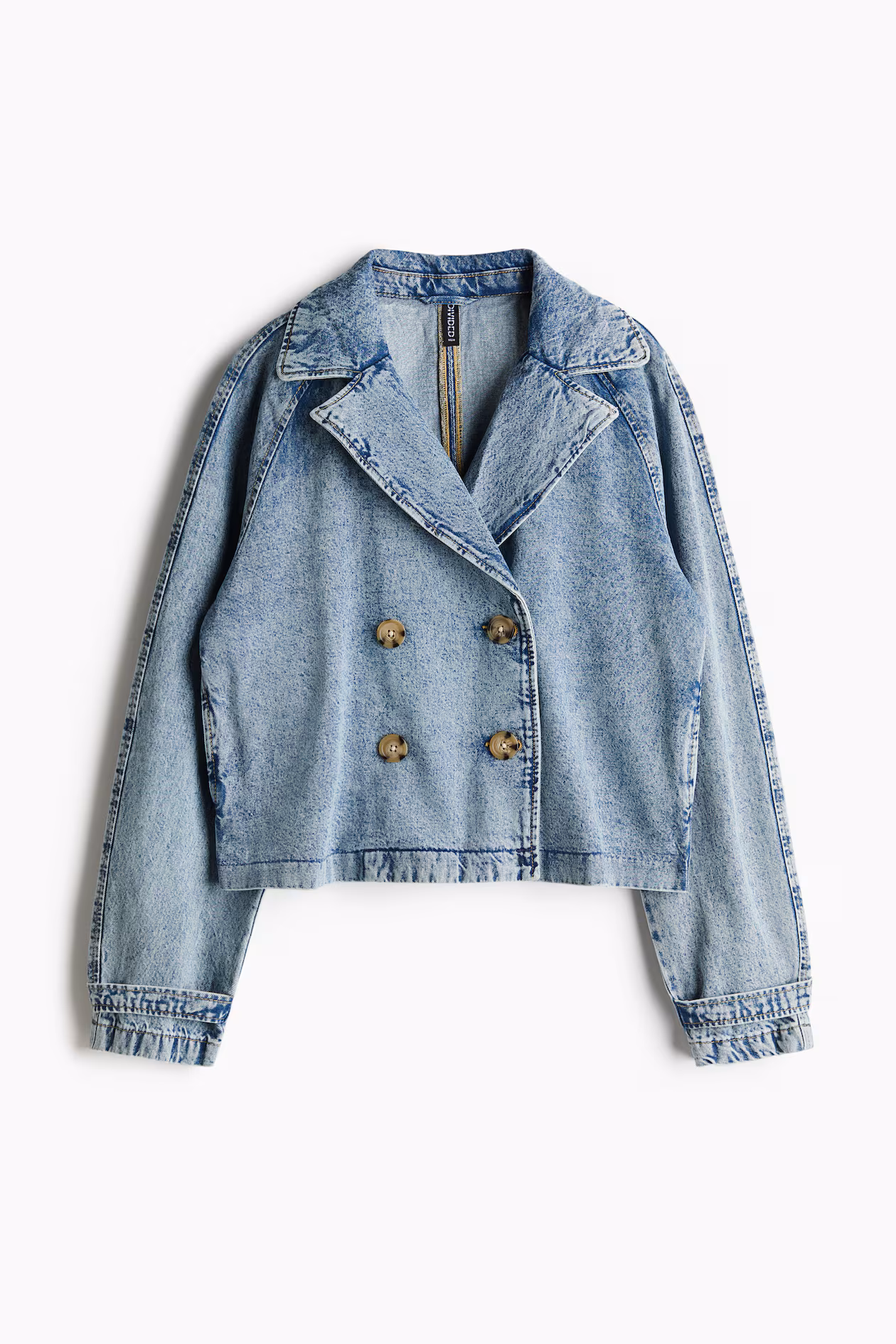 Short, double-breasted trench coat in cotton twill. Collar, notched lapels, and buttons at front. Discreet side pockets, inverted box pleat at back with a tab and button, and long raglan sleeves with a tab and button at cuffs. Unlined.