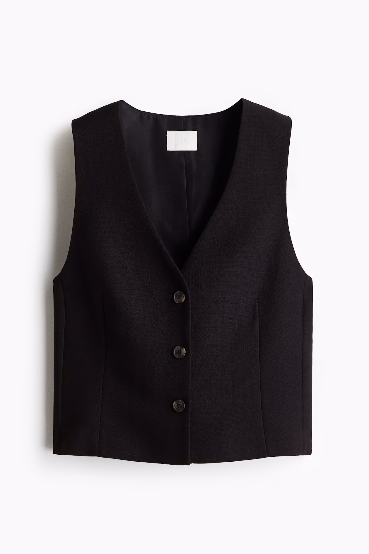 Short, fitted vest in woven fabric with shaping darts at front for a figure-hugging silhouette. Low-cut V-neck and buttons at front. Lined.