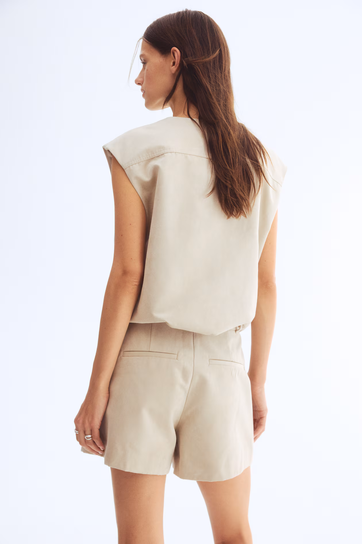 Shorts in woven fabric with a soft, napped finish. High waist, zip fly with button, diagonal side pockets, and welt back pockets.