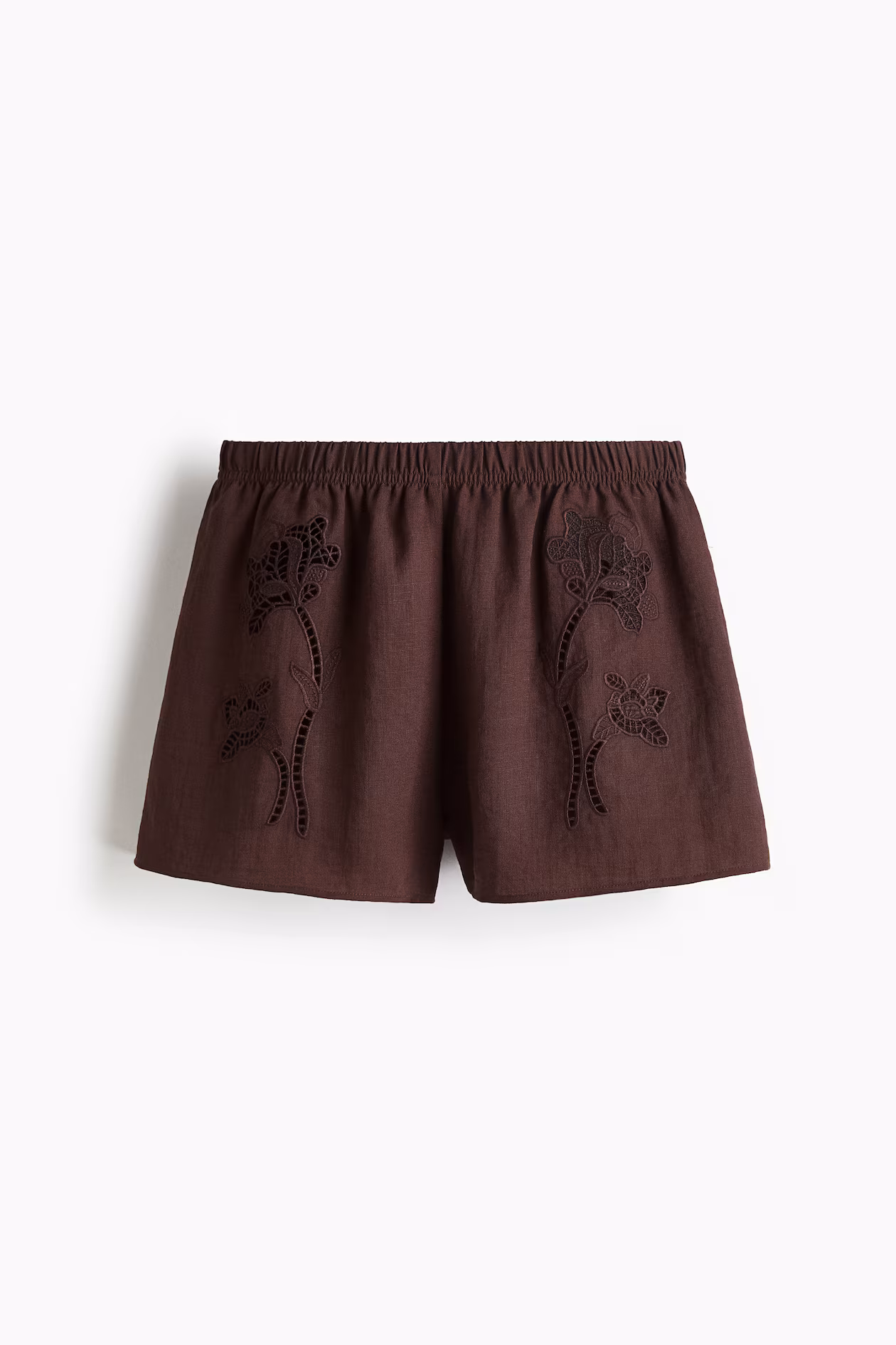 Loose-fit shorts in woven fabric with flower-shaped eyelet embroidery at front. Regular waist and elasticized waistband.