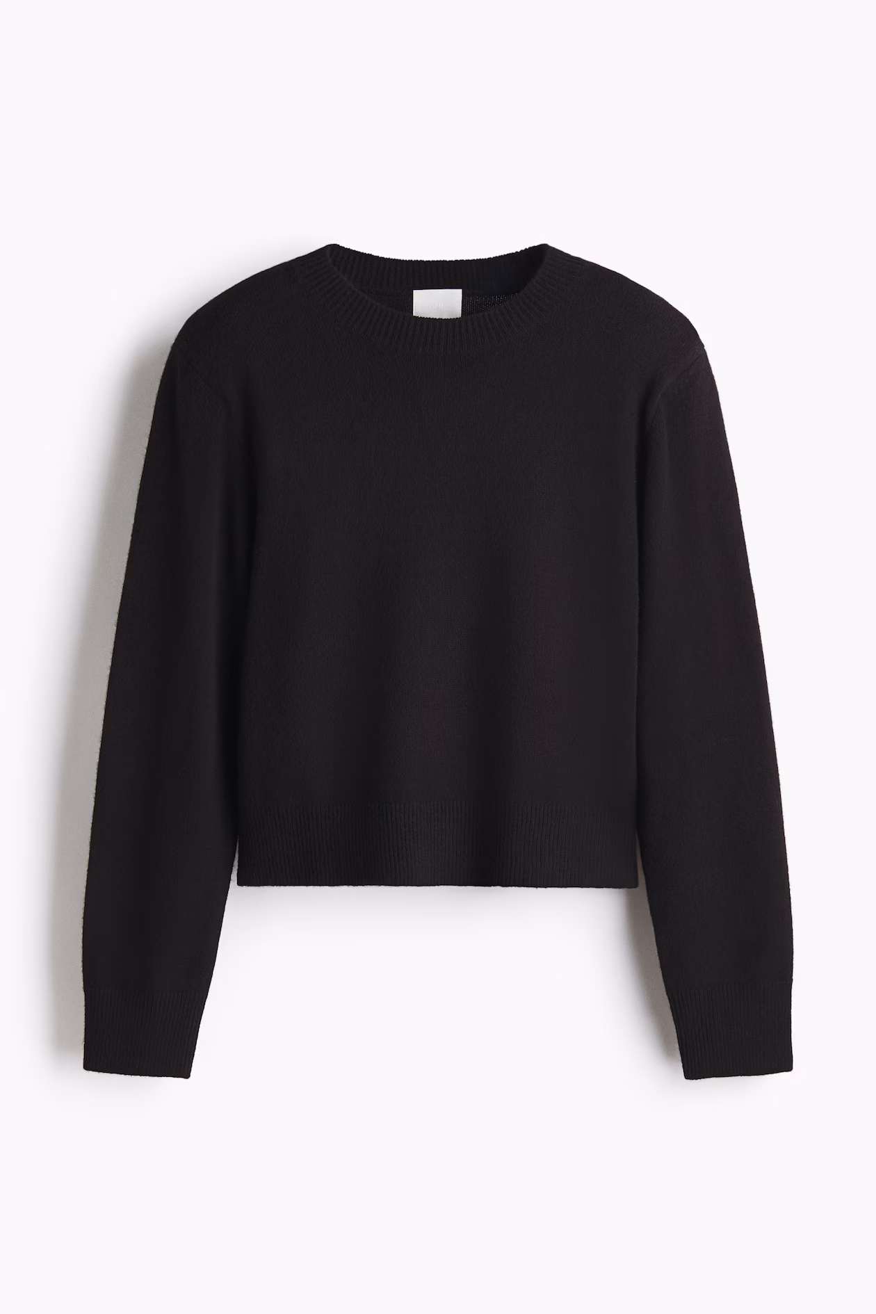 Soft, knit sweater with a round neckline, shoulder pads and ribbing at neckline, cuffs, and hem.