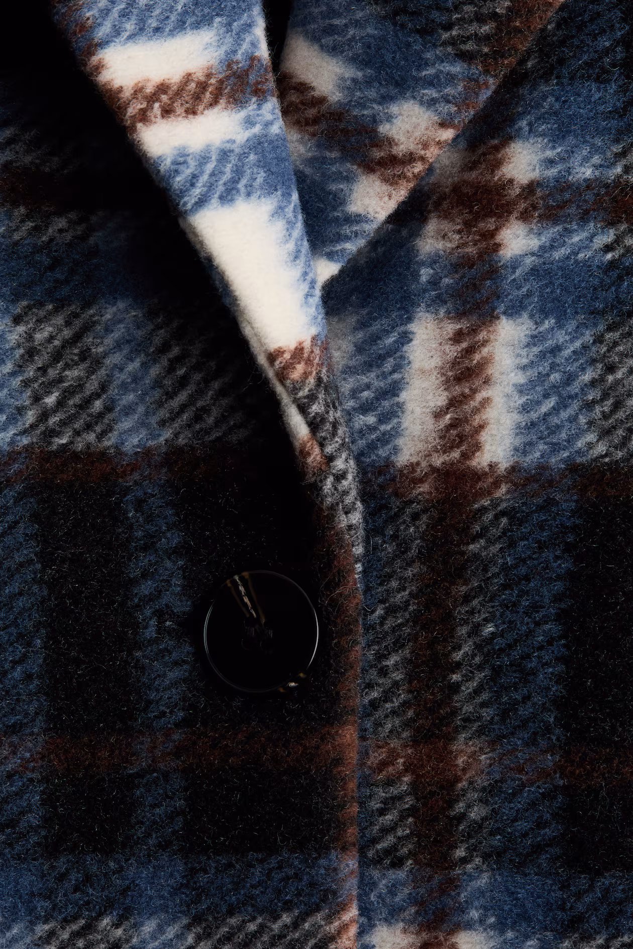 Calf-length, single-breasted coat in felted fabric. Pointed lapels, buttons at front, welt front pockets, and shoulder pads. Vent at back. Lined.