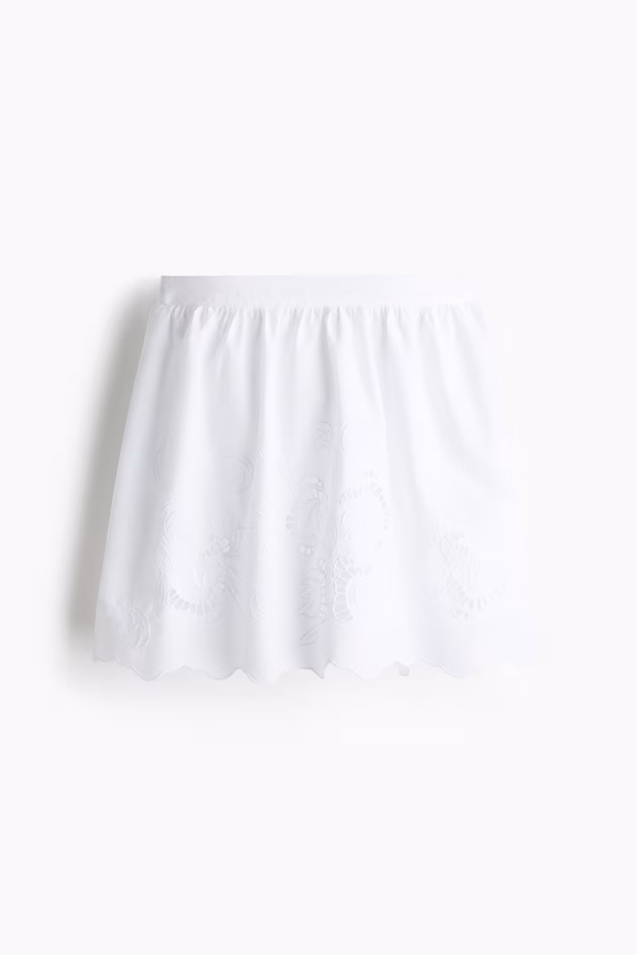 Short, flared skirt in eyelet-embroidered, airy woven cotton. High waist, concealed zipper at one side with hook-and-eye fastener, and a scalloped-edge hem. Lined.