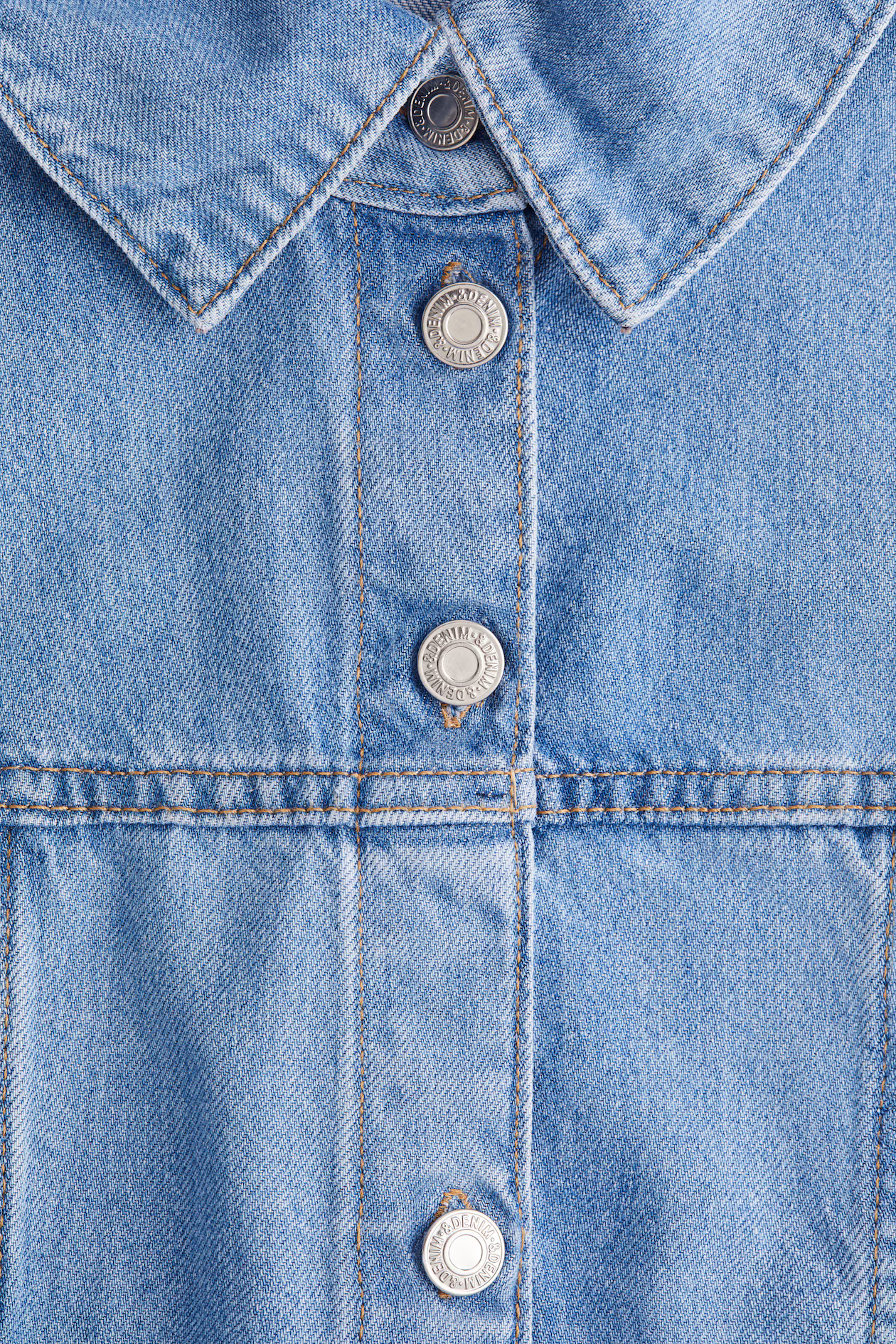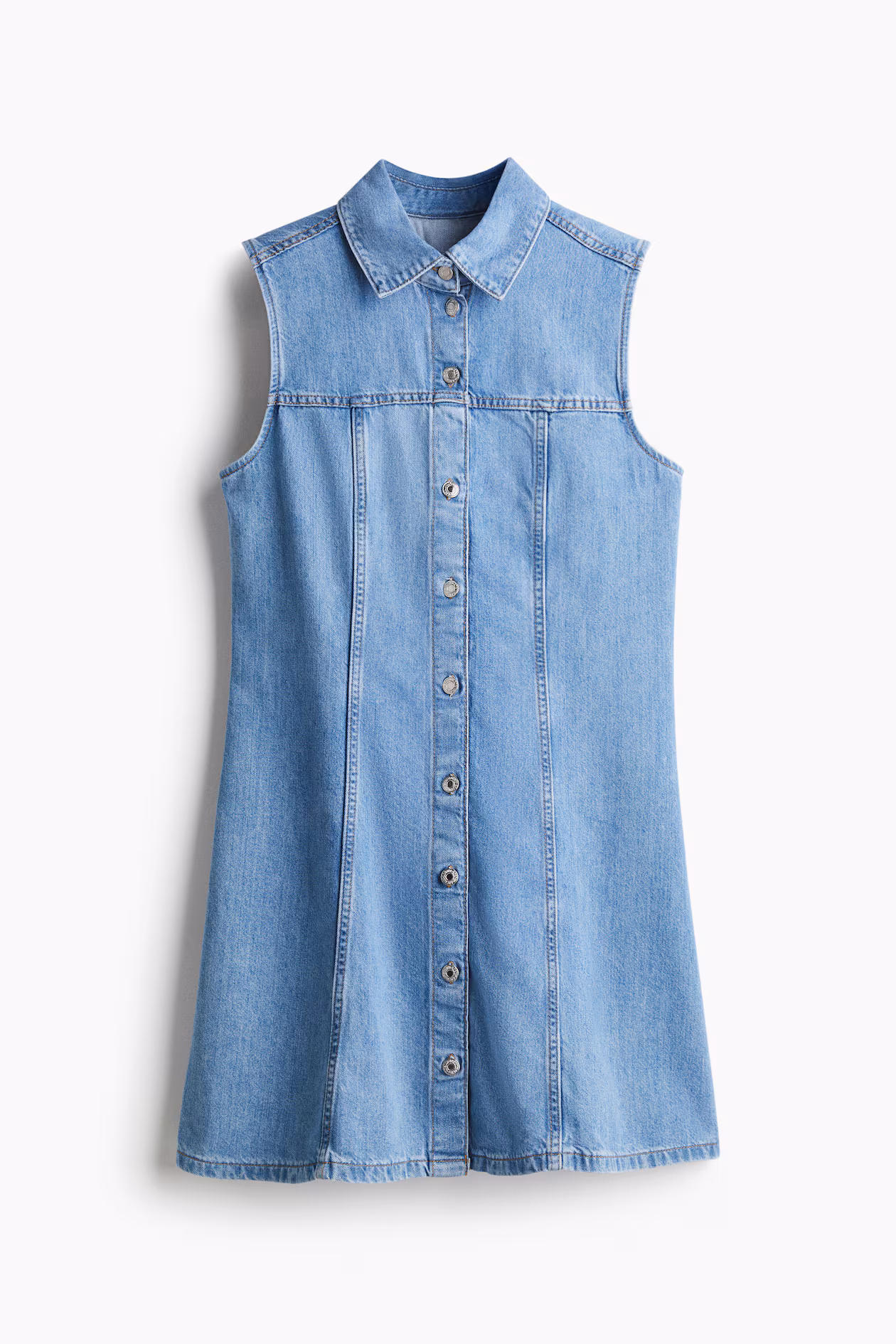 Sleeveless, knee-length shirt dress in cotton denim. Collar, metal buttons at front, and a yoke at front and back. Gently flared skirt. Unlined.