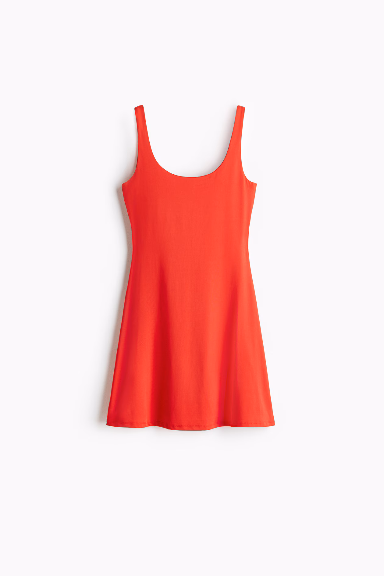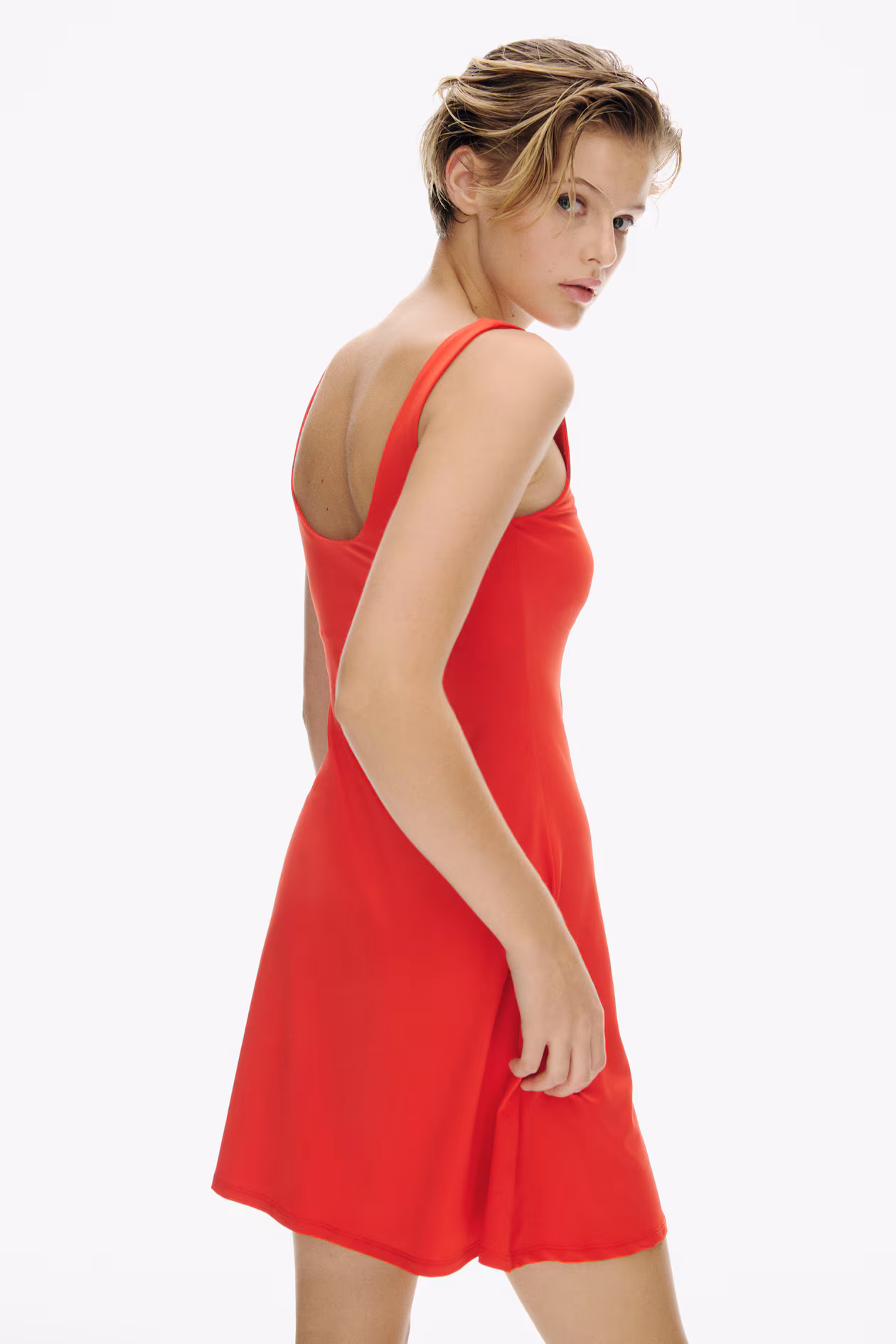 Mini dress in soft microfiber with a fitted bodice. Wide shoulder straps, scoop neck at front and back, and a gently flared skirt. Lined at top.
