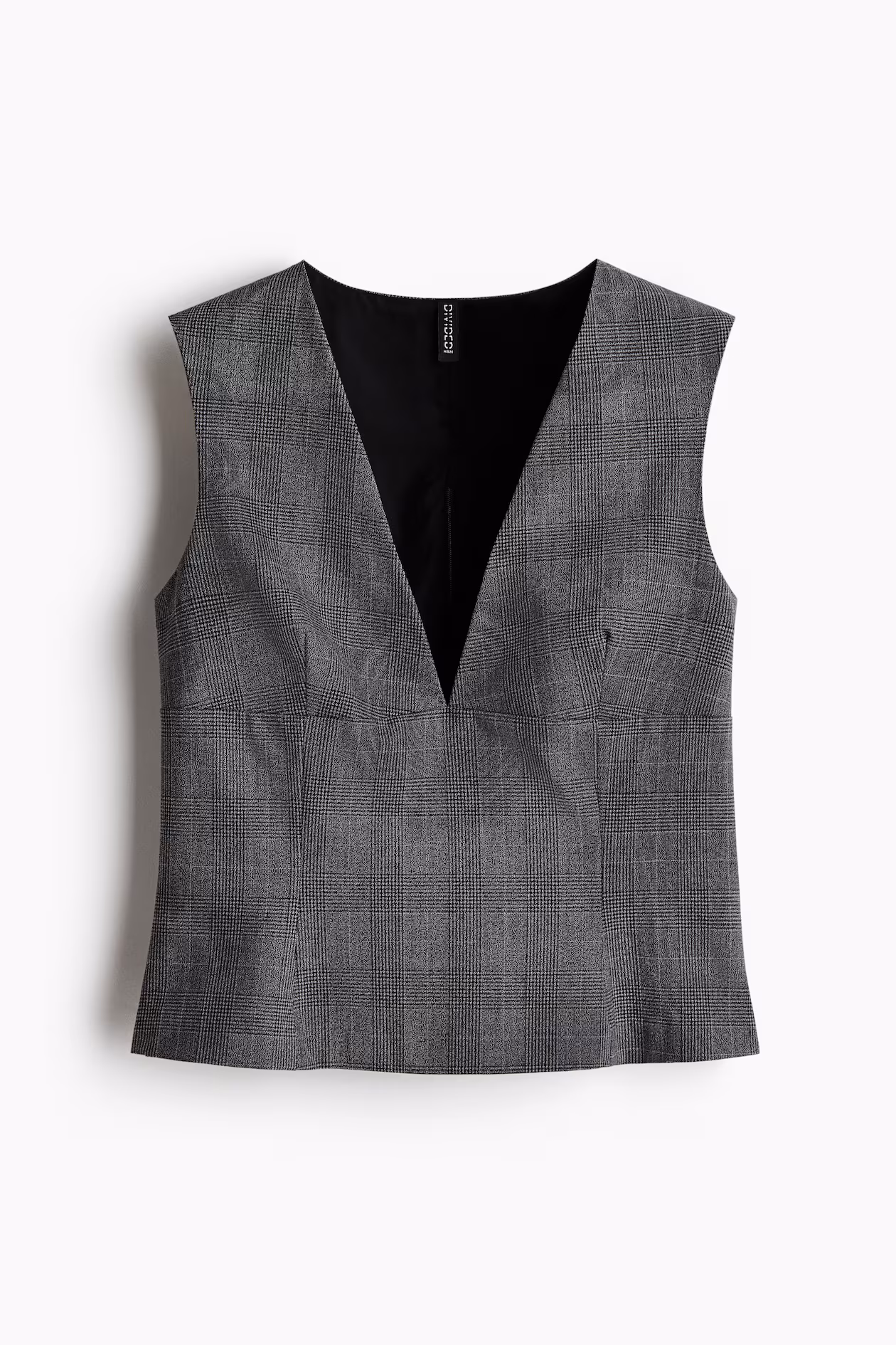 Fitted, sleeveless top in woven fabric. Low-cut V-neck at front, concealed zipper at back, and shaping seams at front and back. Lined at top.