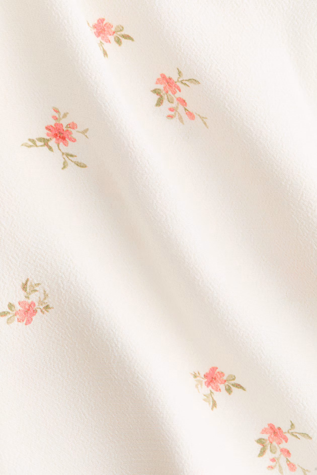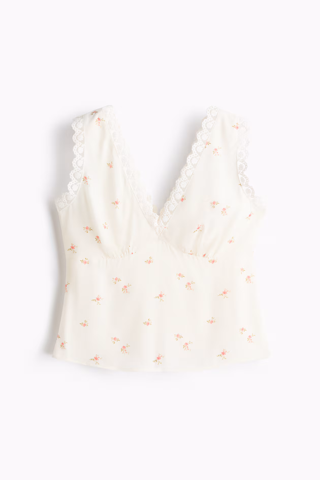 Fitted, sleeveless top in woven viscose. Low-cut V-neck at front and back, gathered cups, and scalloped-edge lace trim at neckline and armholes.