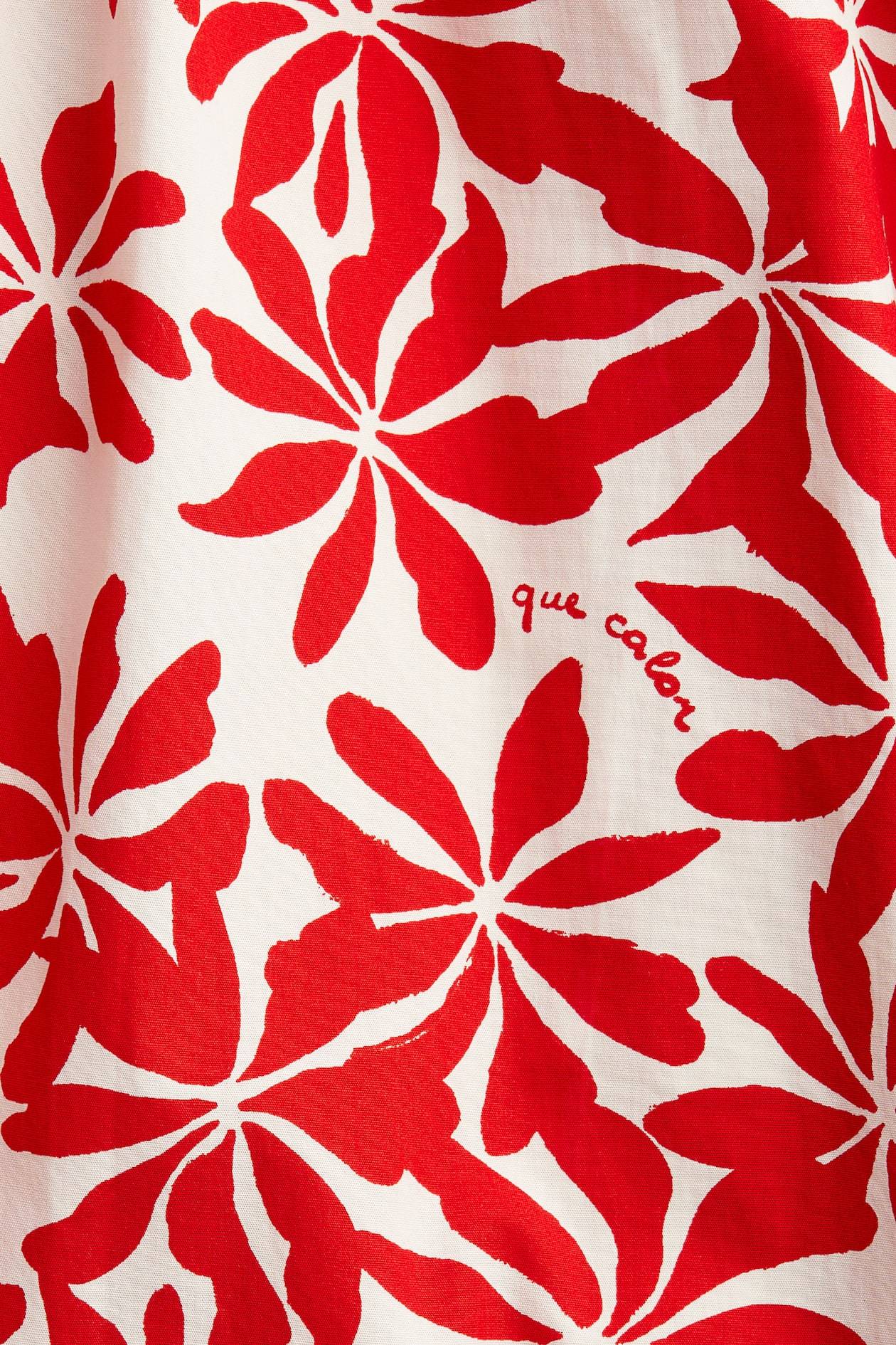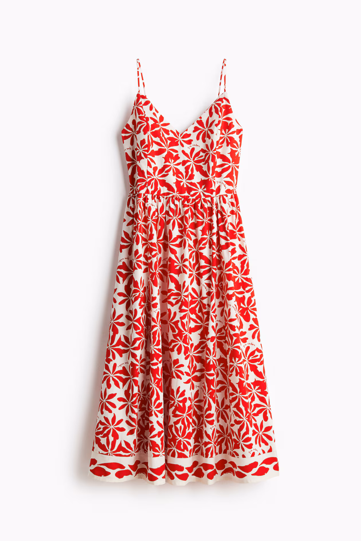 Calf-length dress in woven cotton with a fitted, lined bodice and a flared, unlined skirt. Adjustable, extra-narrow shoulder straps, V-neck, and a smocked section at back.