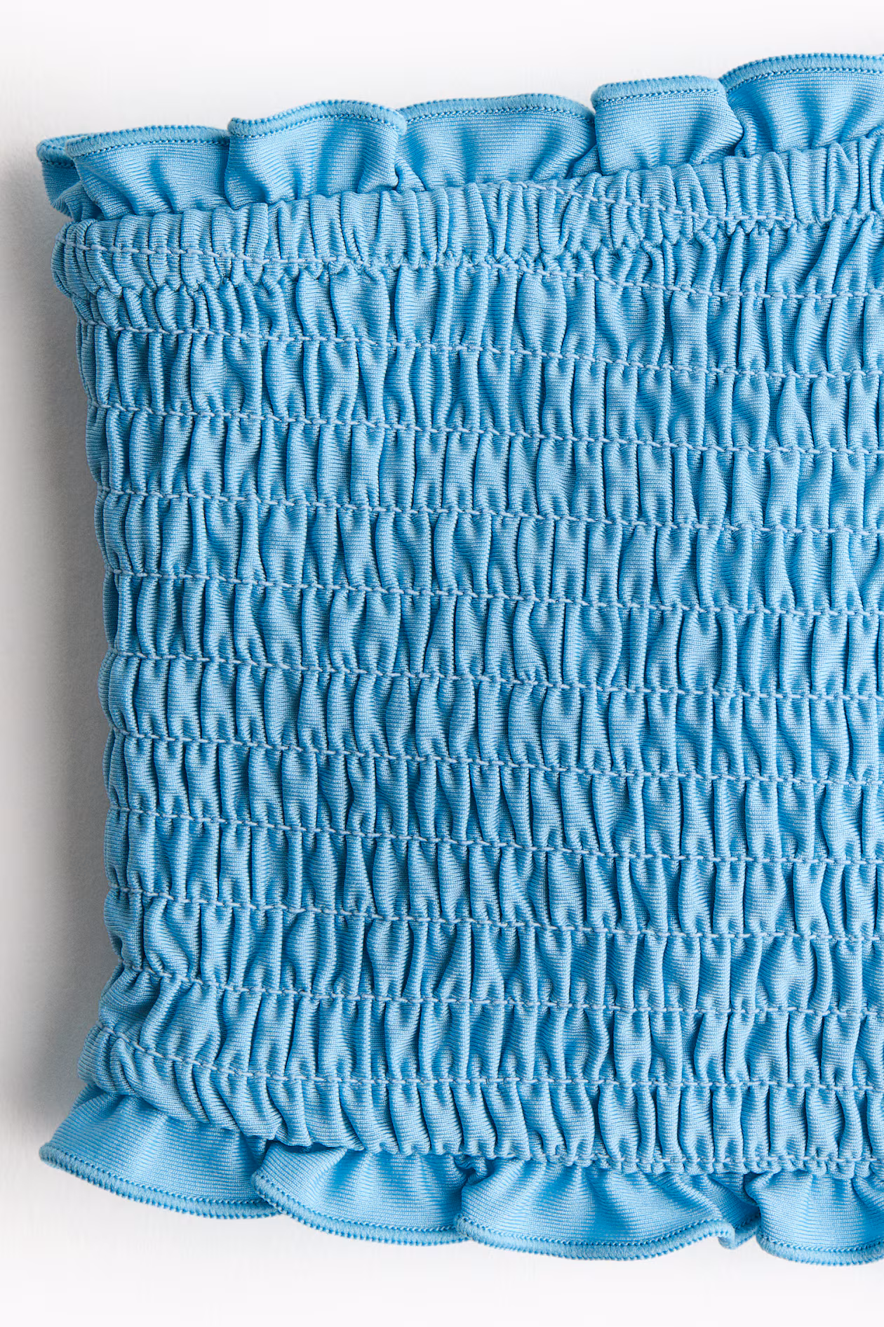 Lined, smocked bandeau bikini top. Silicone trim inside upper edge, boning in sides, and ruffle trim at upper and lower edges. No fasteners.