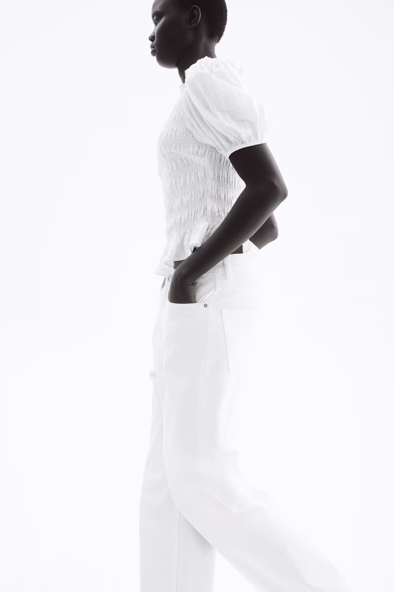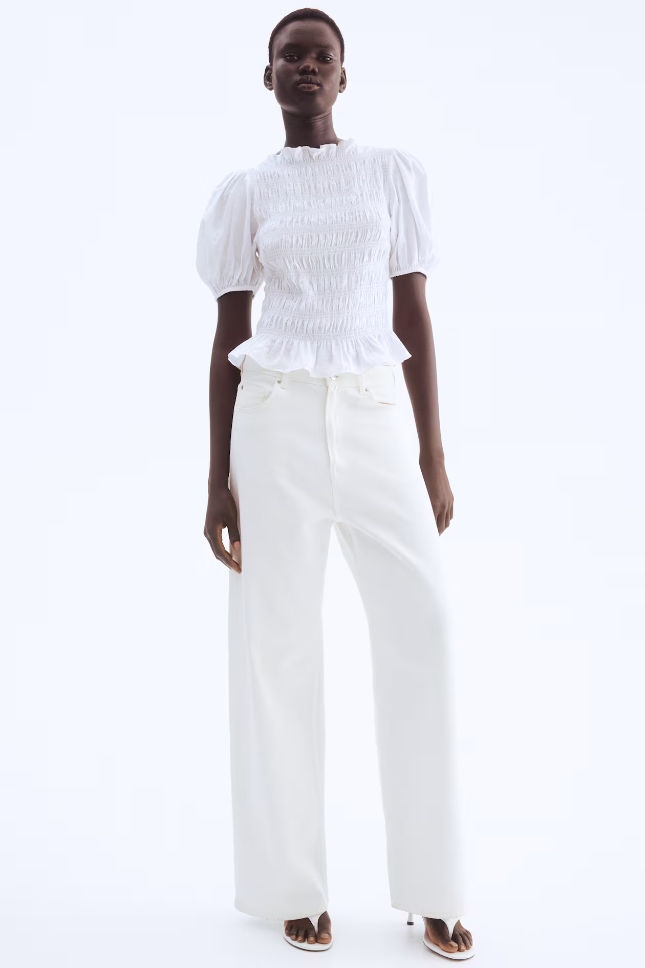 Fitted blouse in smocked woven fabric. Boat neck, short puff sleeves with narrow elastic at cuffs, and a flared hem.