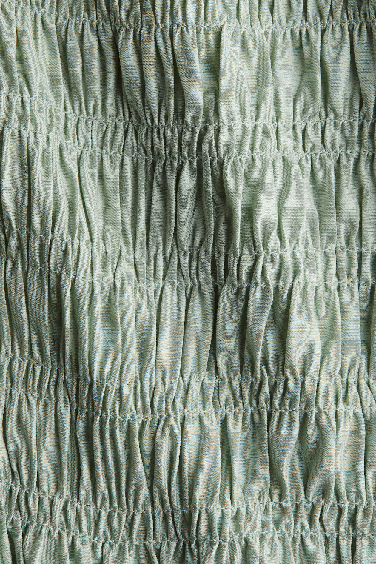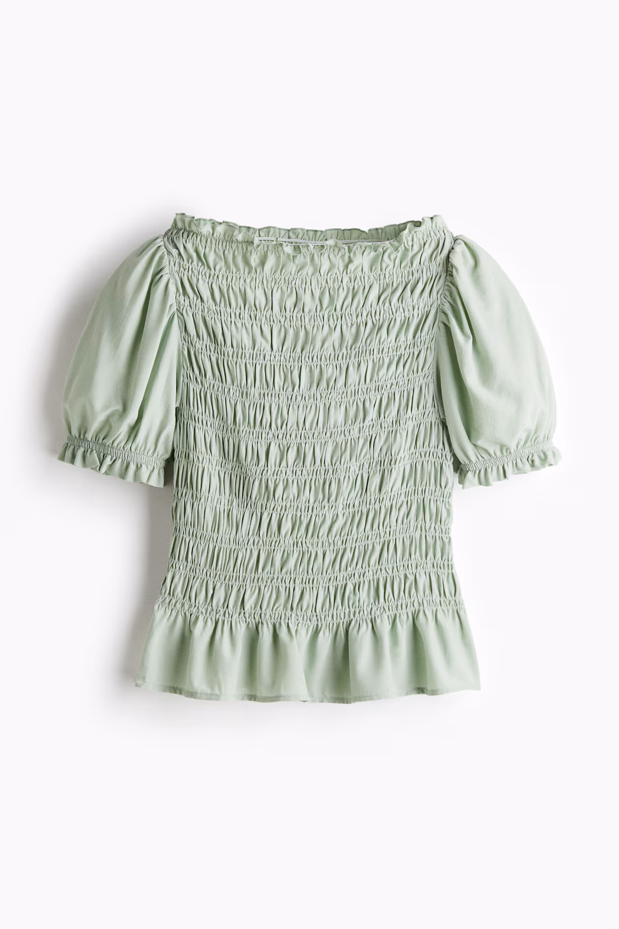 Fitted blouse in smocked woven fabric. Boat neck, short puff sleeves, and ruffle-trimmed cuffs with narrow elastic. Flared hem.