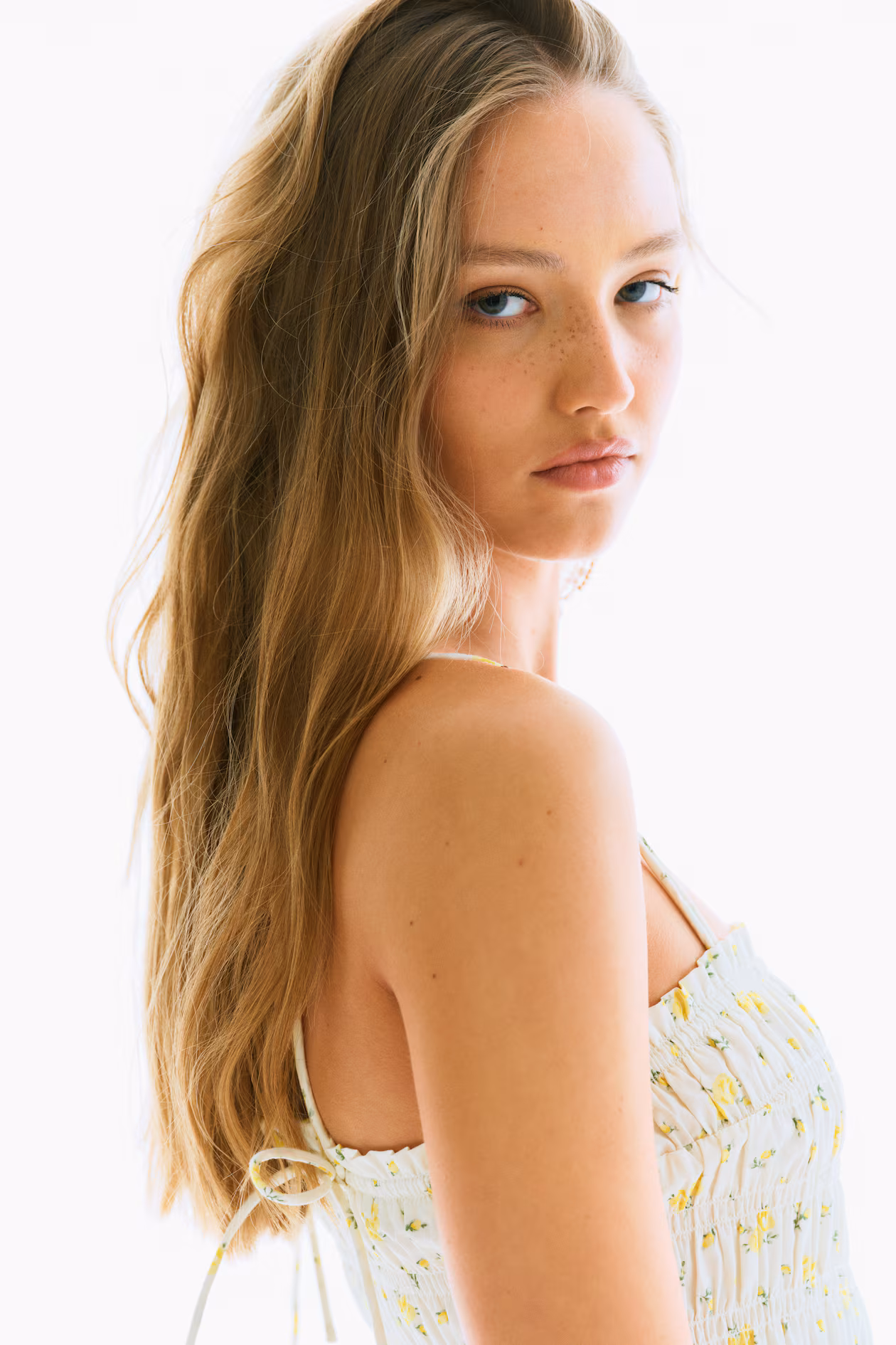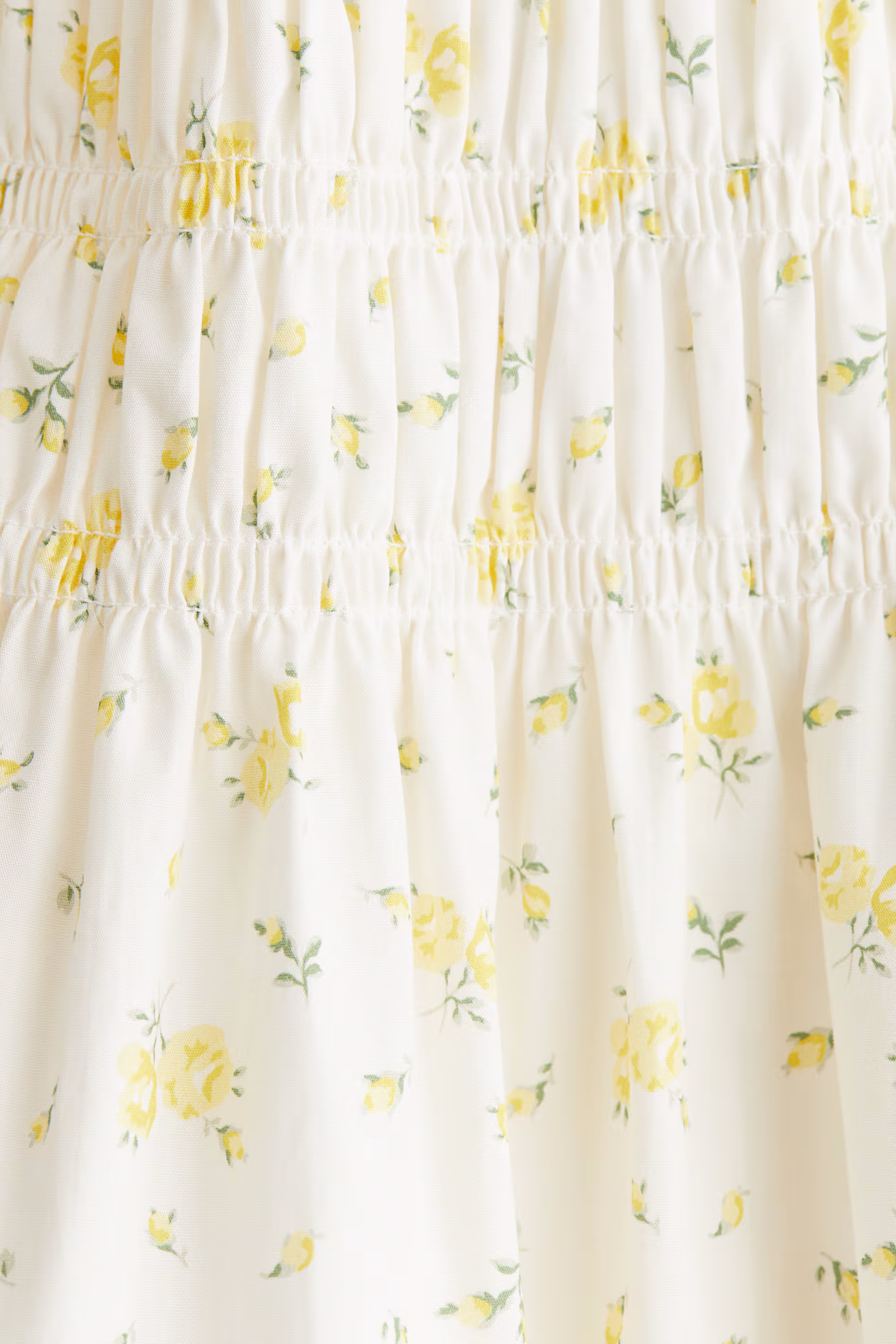 Short dress in woven cotton with a smocked bodice and flared skirt. Doubled extra-narrow shoulder straps that thread through small loops and tie at back. Square neckline and a gathered seam at waist. Lined.