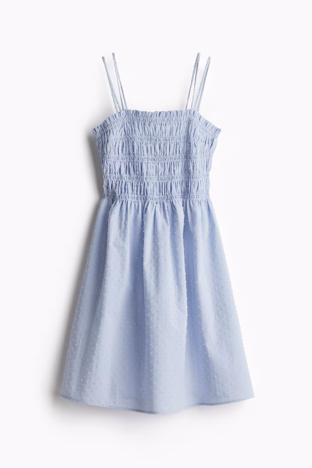 Short dress in woven cotton with a smocked bodice and flared skirt. Doubled extra-narrow shoulder straps that thread through small loops and tie at back. Square neckline and a gathered seam at waist. Lined.