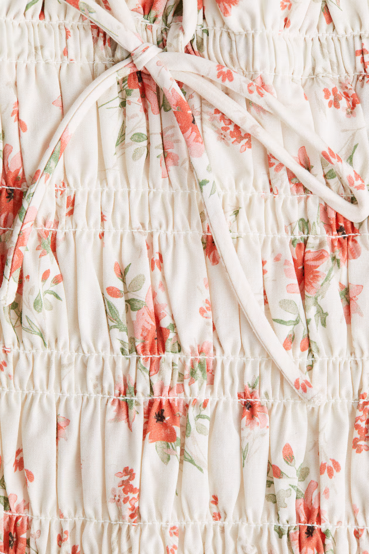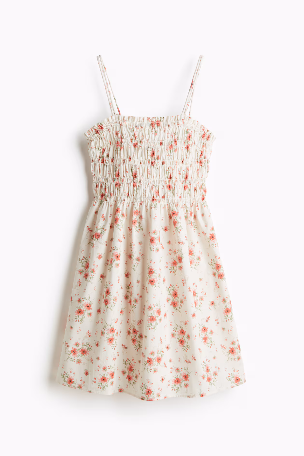 Short dress in woven cotton with a smocked bodice and flared skirt. Doubled extra-narrow shoulder straps that thread through small loops and tie at back. Square neckline and a gathered seam at waist. Lined.