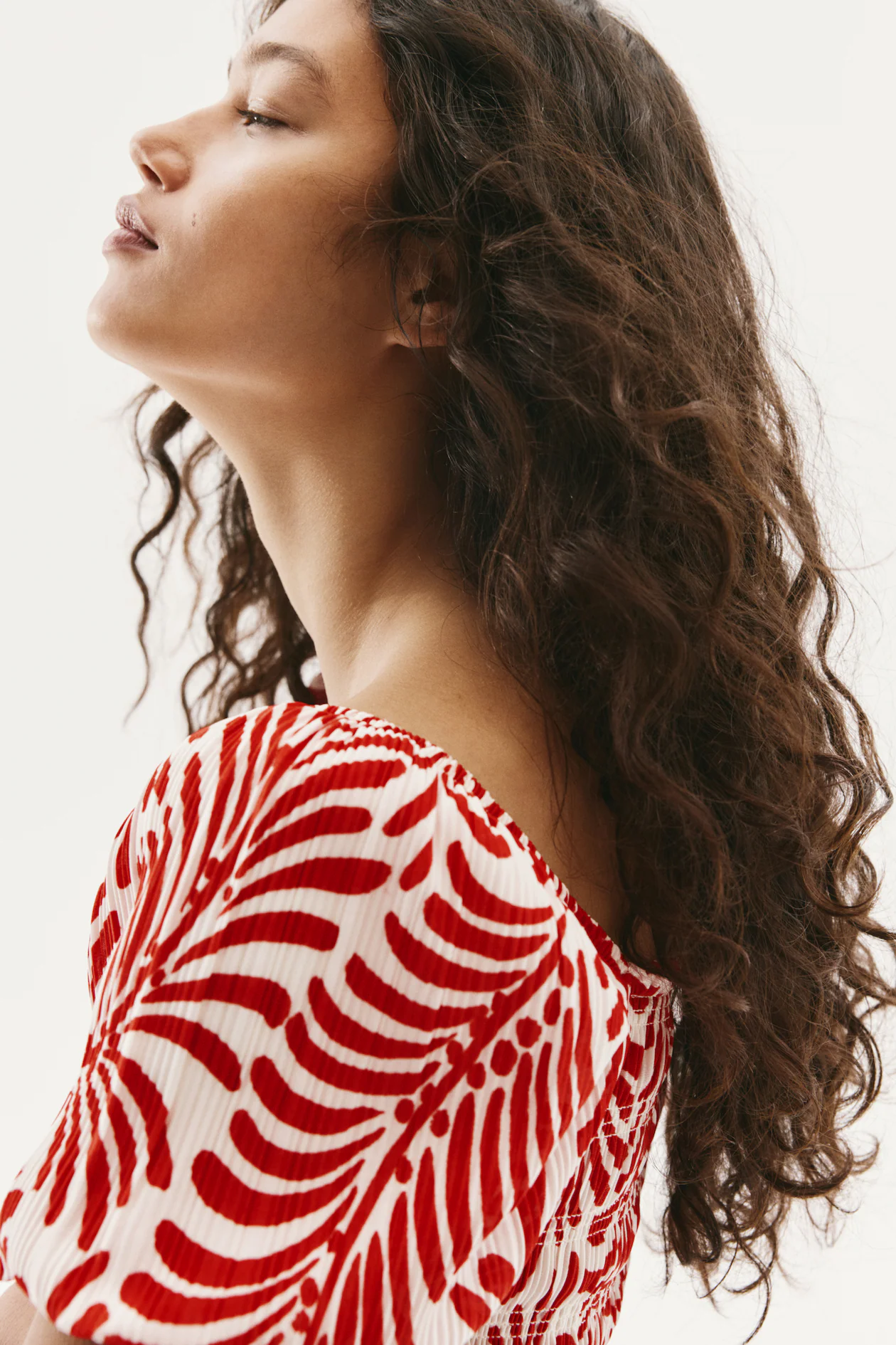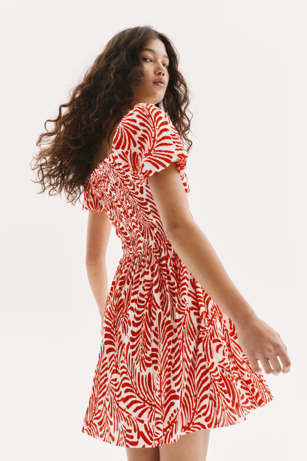 Short dress in crinkled jersey with a fitted, smocked bodice and a flared skirt. Square neckline, narrow elastic over shoulders, and short balloon sleeves. Gathered seam at waist.